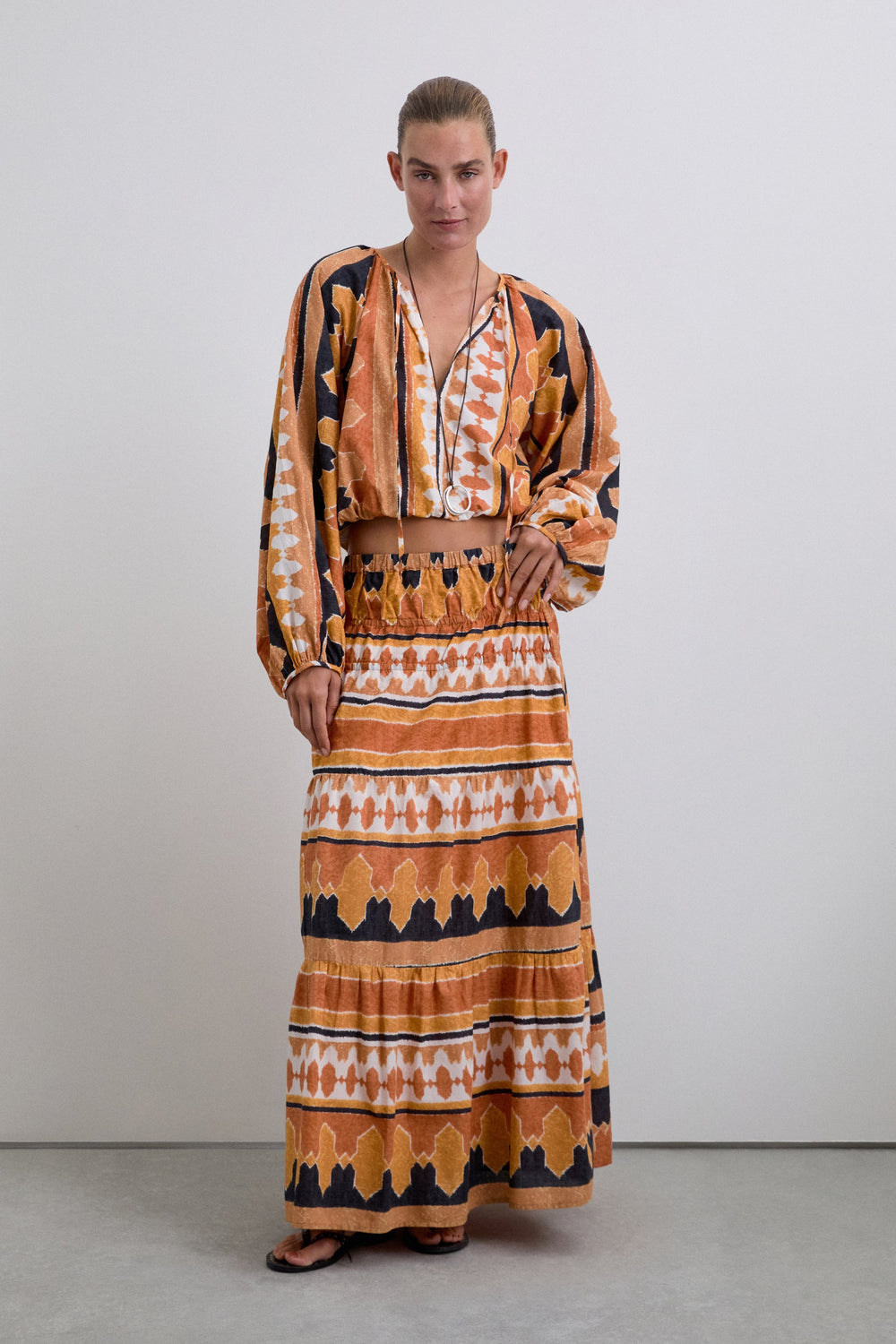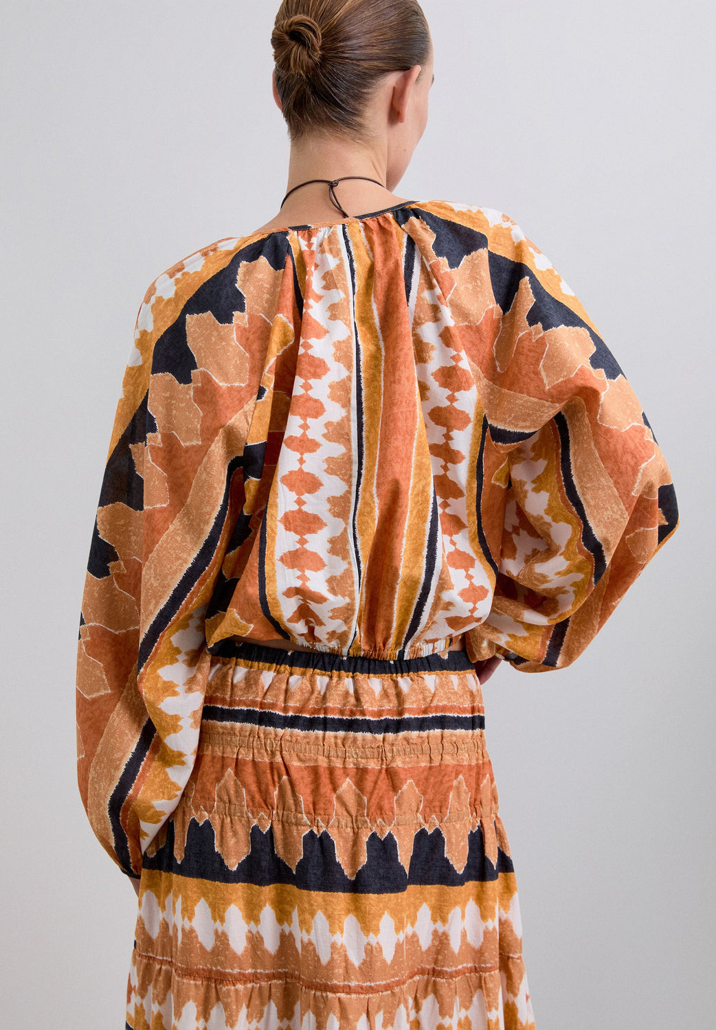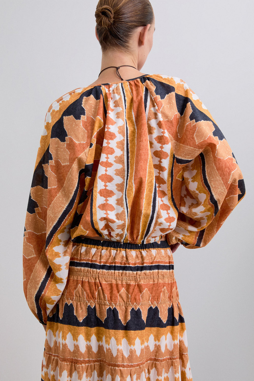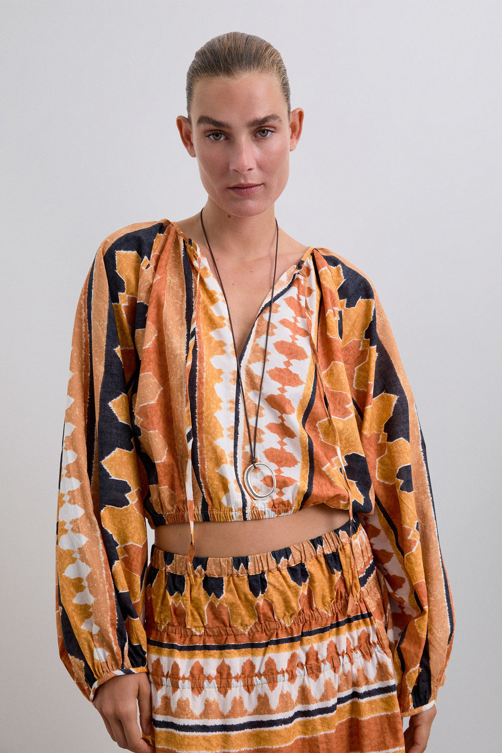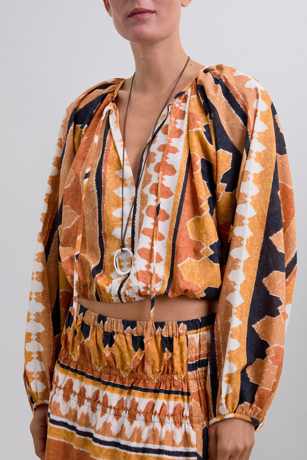 Printed shirt made of 100% organic BCI cotton. Cropped Adjustable V-neck with lacing. Long puffed sleeves. Gathered edge detailing.