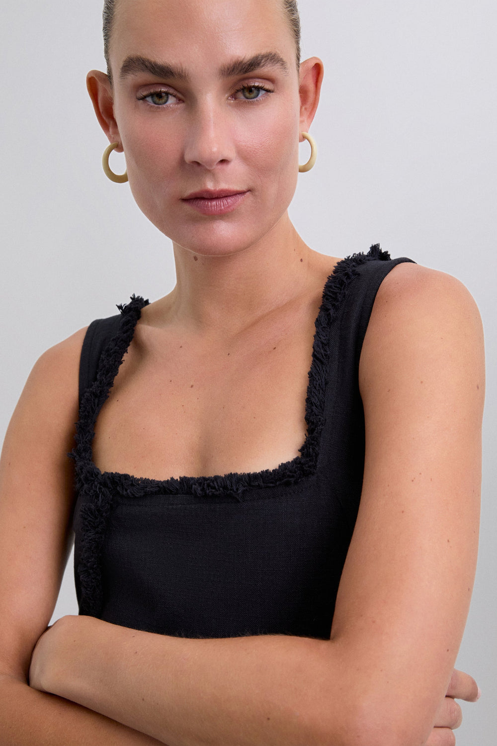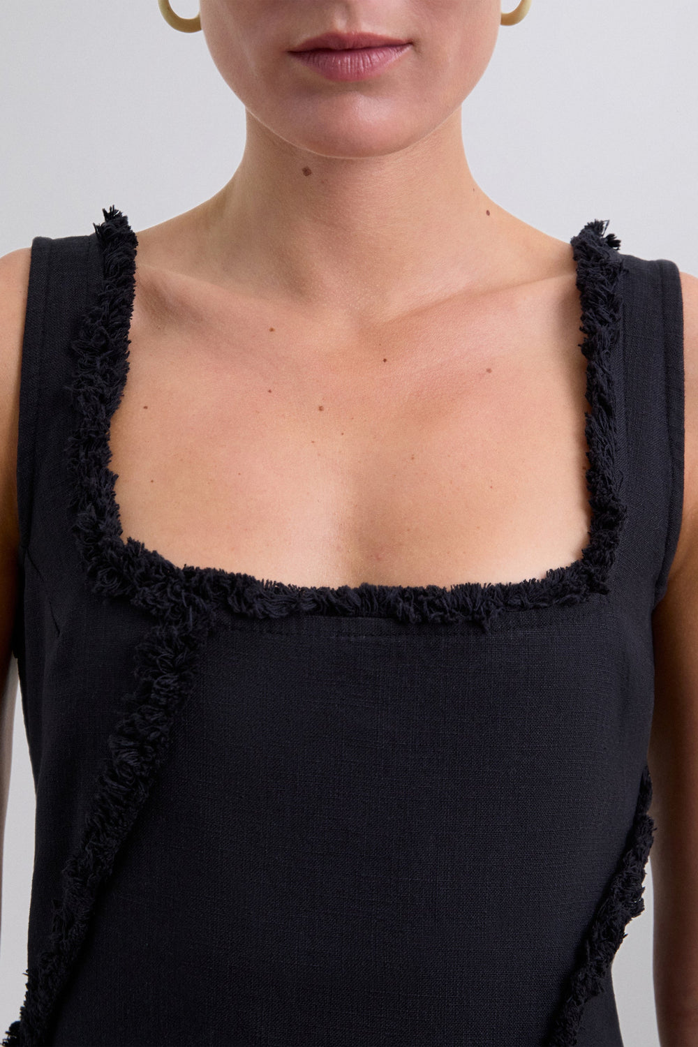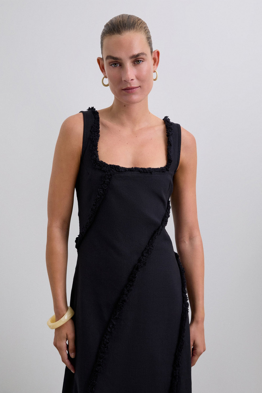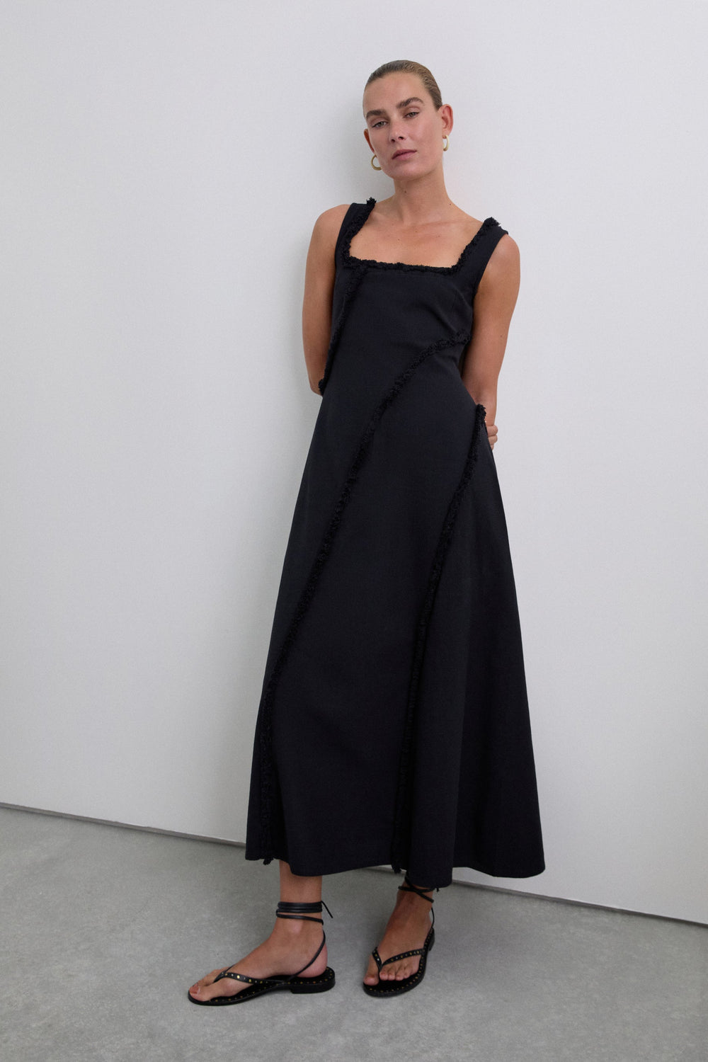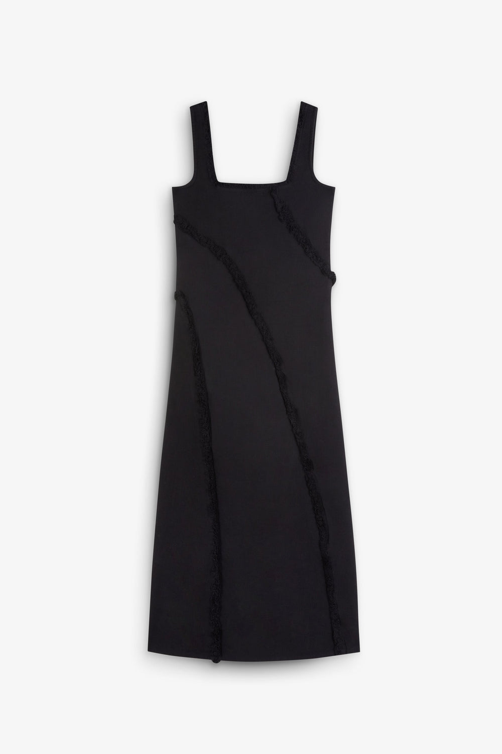 Midi dress made of 100% organic BCI cotton. Straps. Square-cut neckline. Topstitched fringe detail.