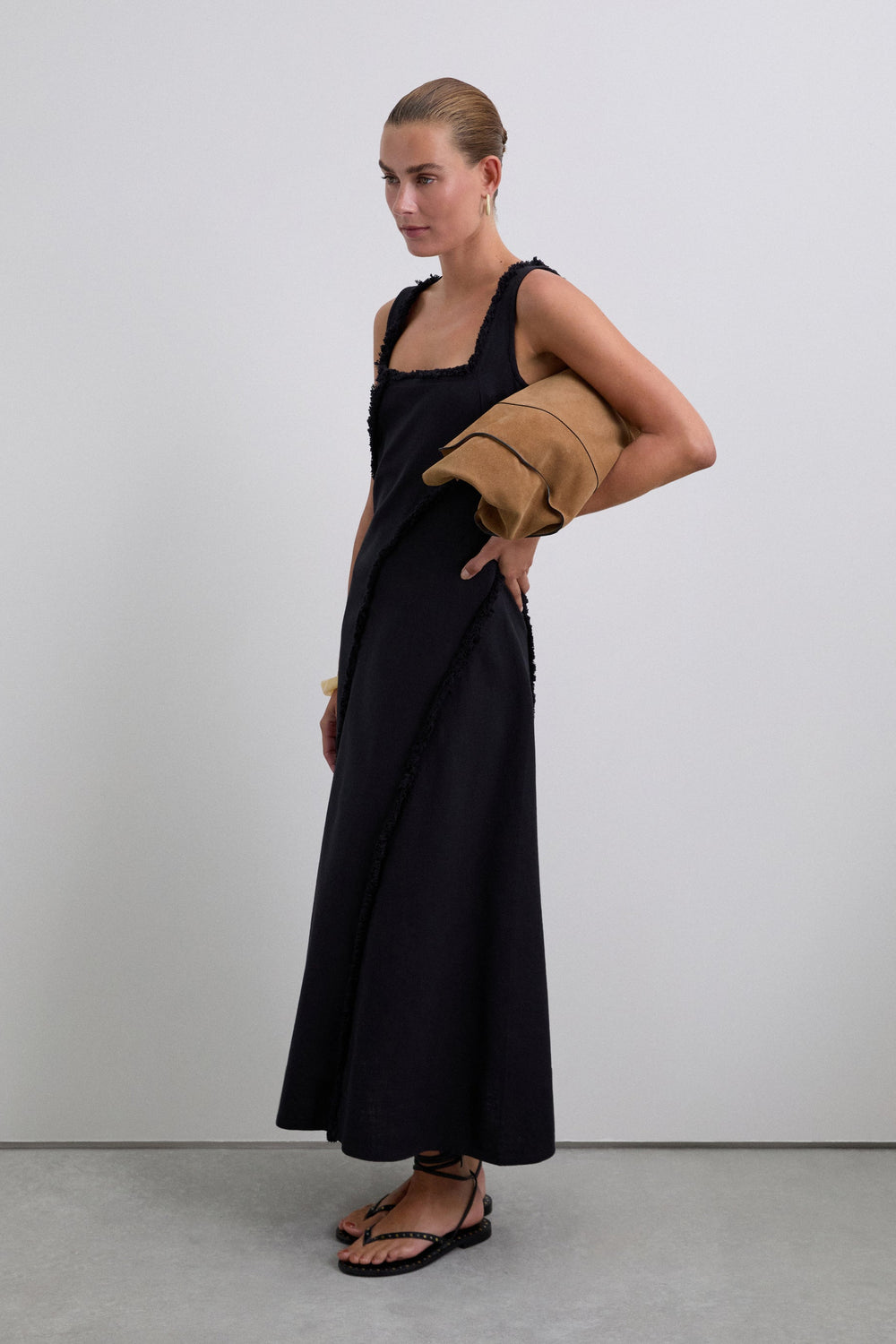 FRINGED DRESS WITH TOPSTITCHING
