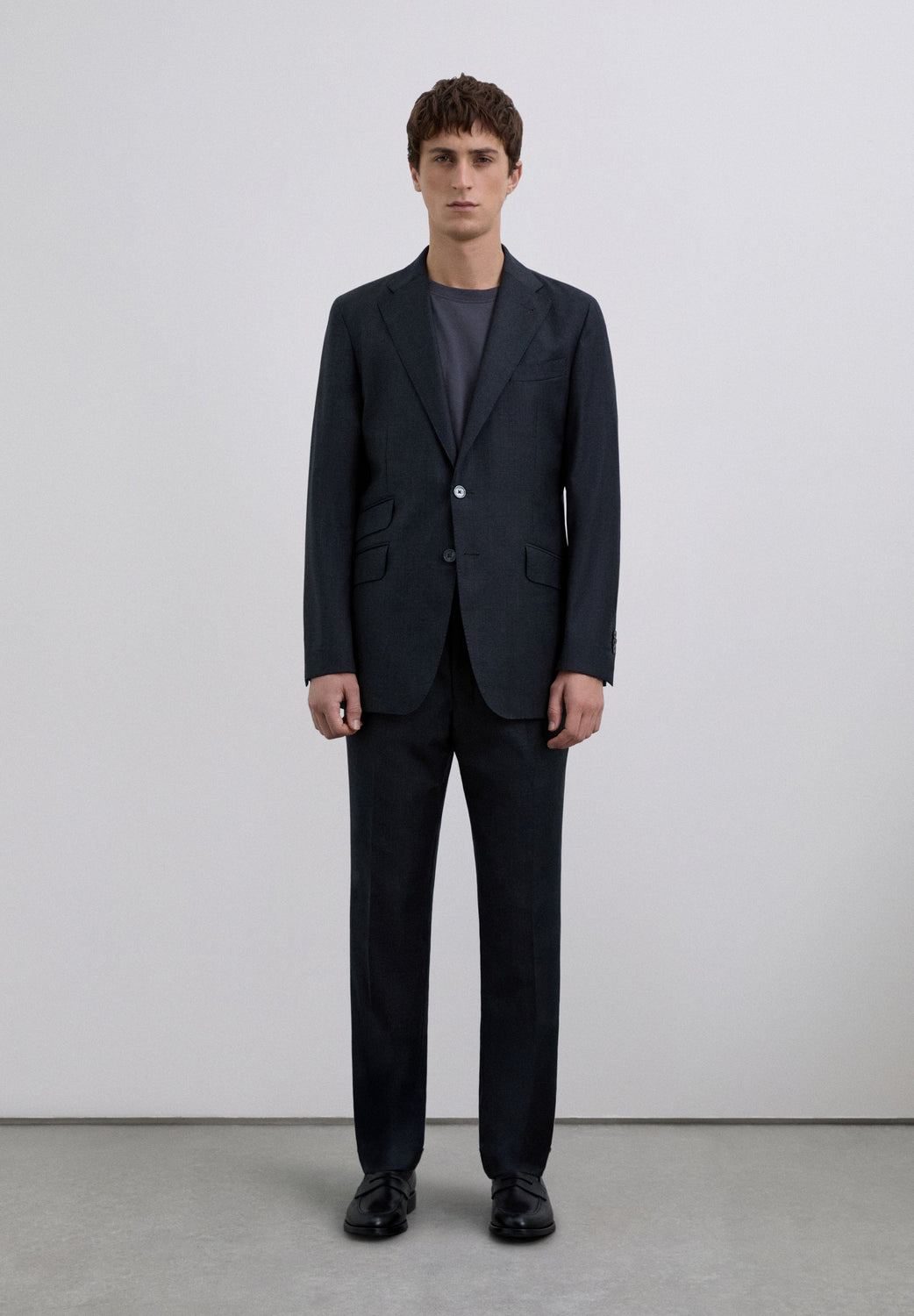 Americana confeccionada en 100% lana. Solapas regulares. Bolsillo de pecho con ribete. Tres bolsillos de solapa inclinados. Cierre frontal mediante dos botones.