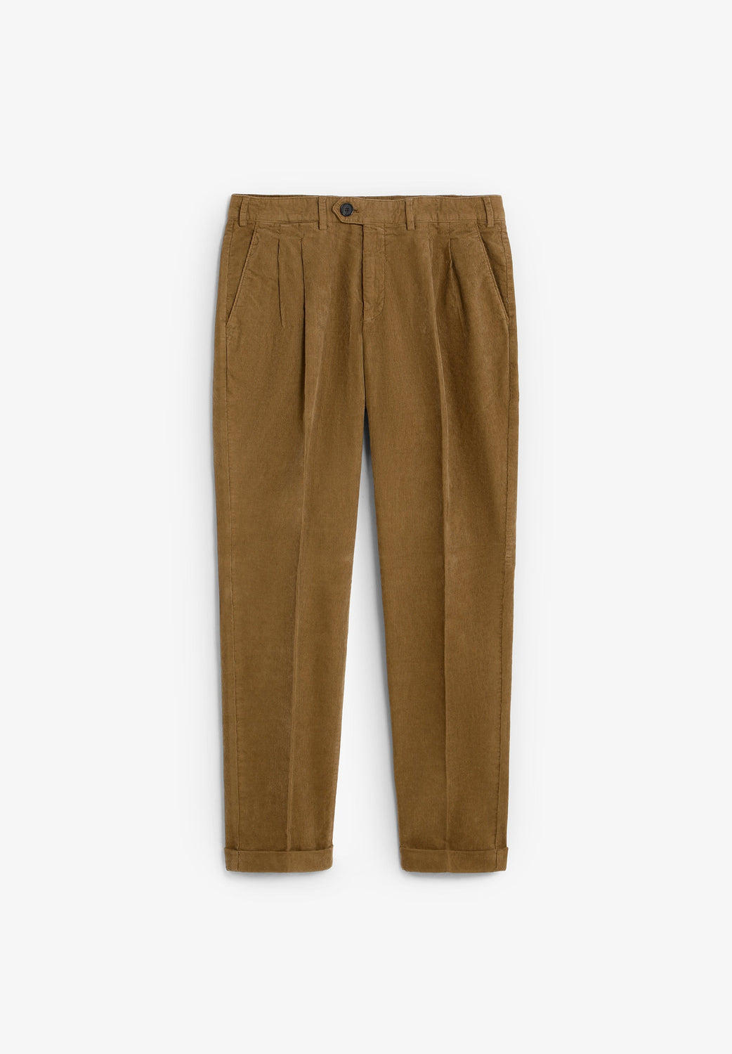 Chino trousers made from corduroy. Loose Fit cut with darts. Concealed zip fastening with an extended button at the waist. Side and back pockets.