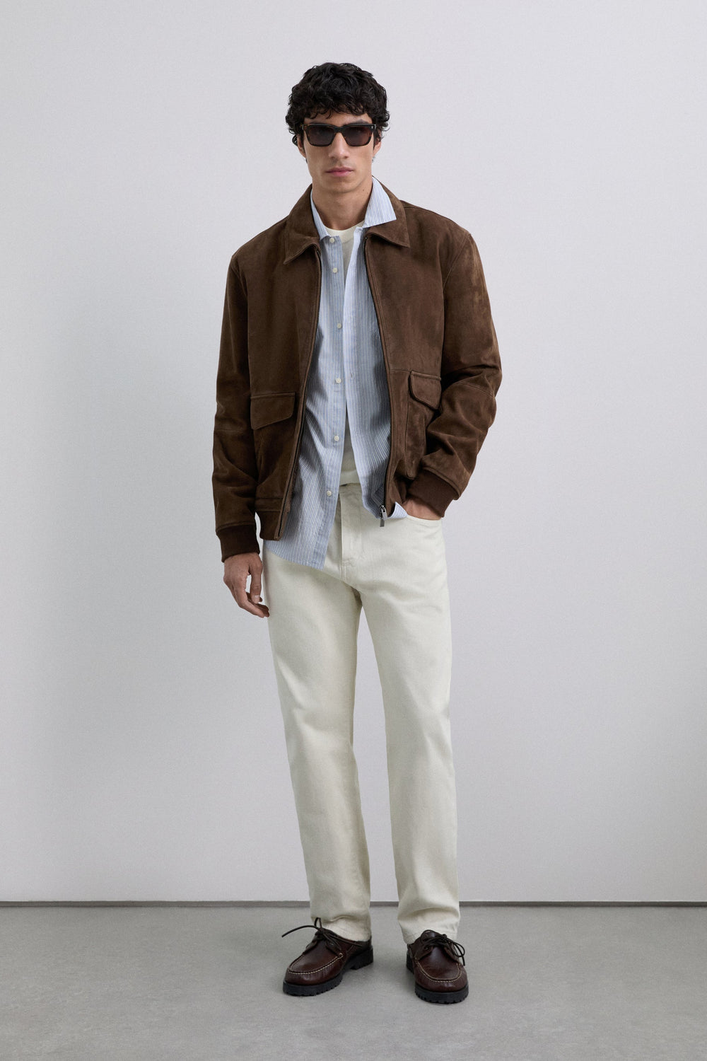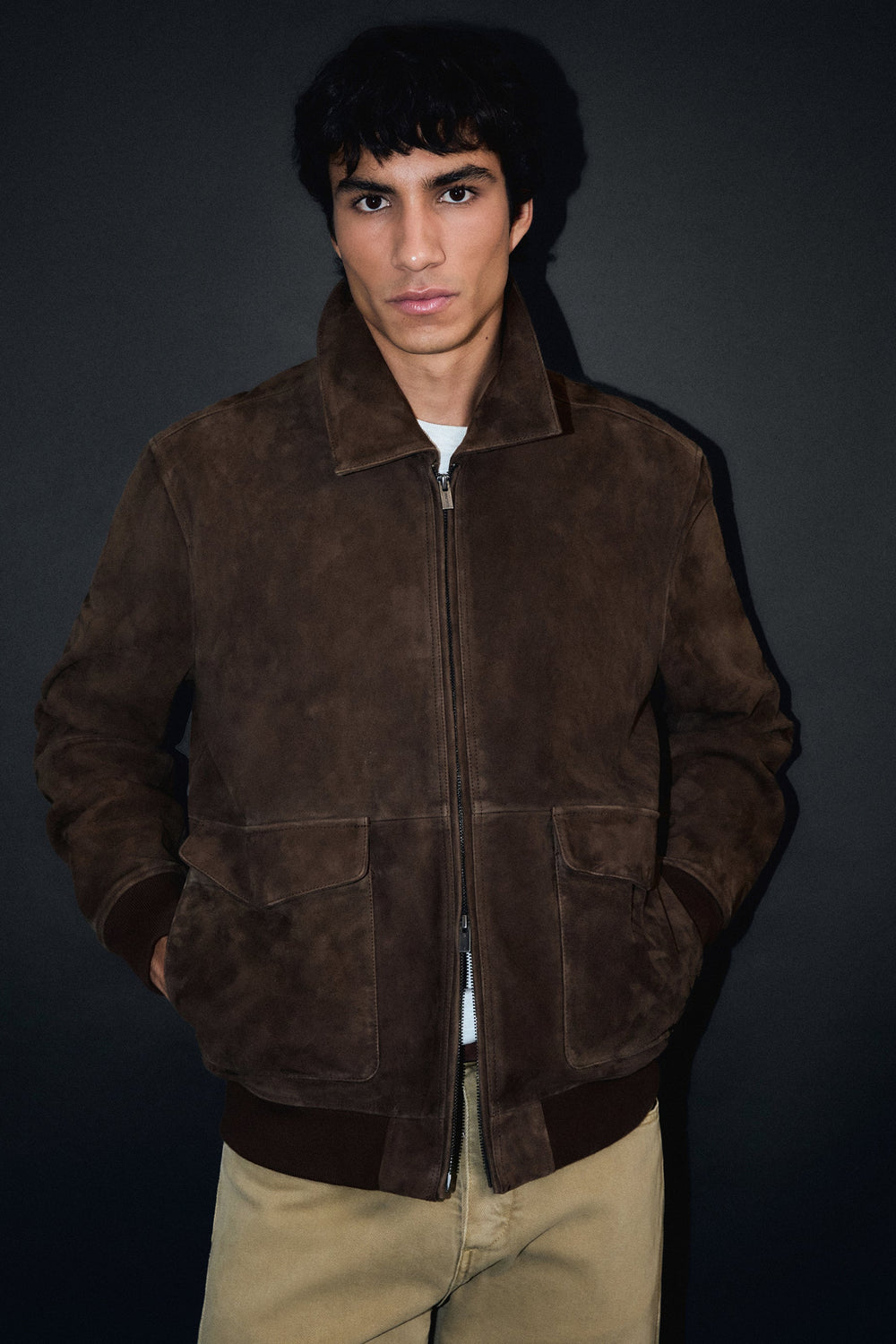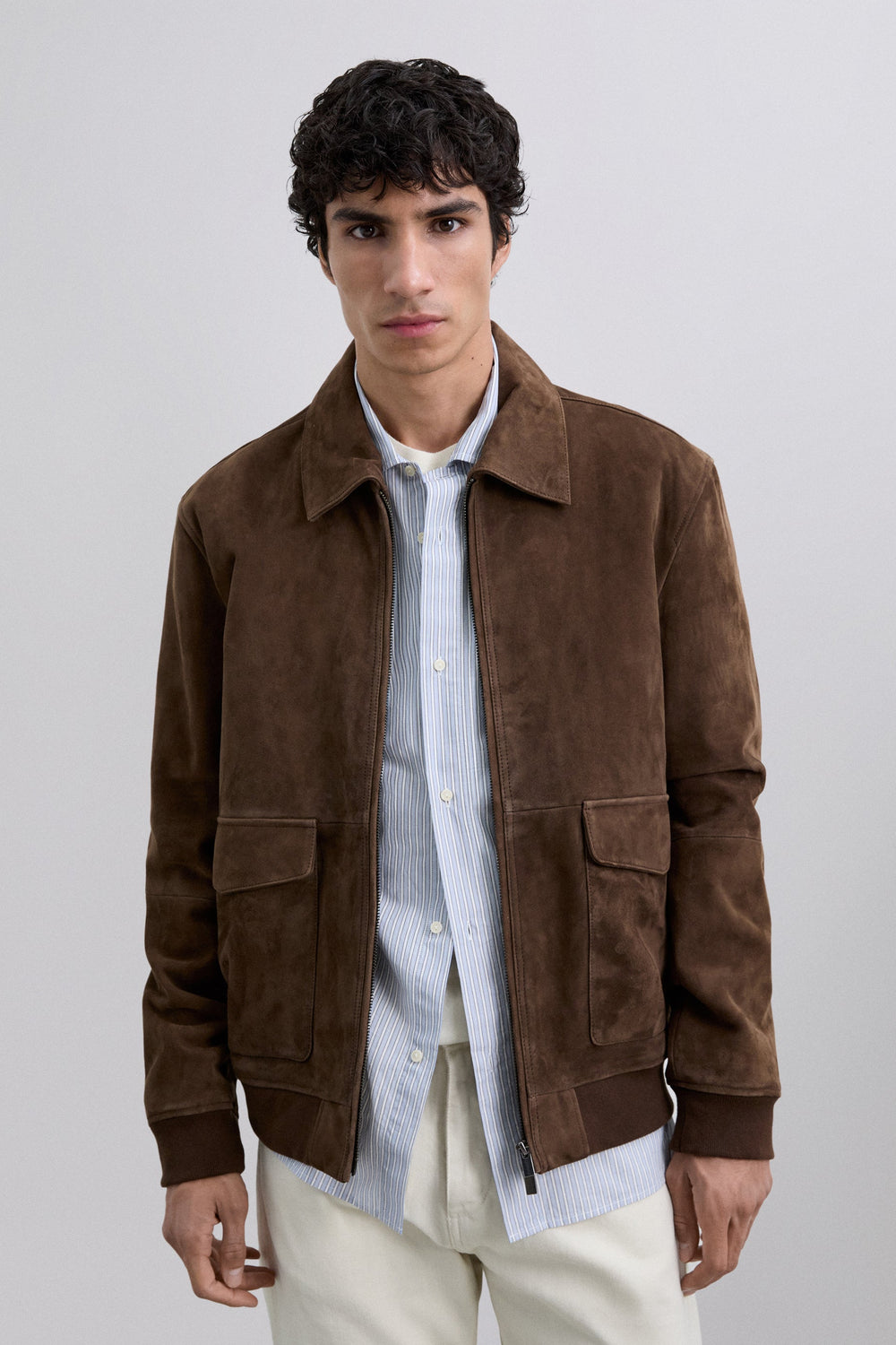 Jacket made of 100% goat suede. Double front zip fastening. Ribbed cuffs and hem. Two front pockets with flap fastening.