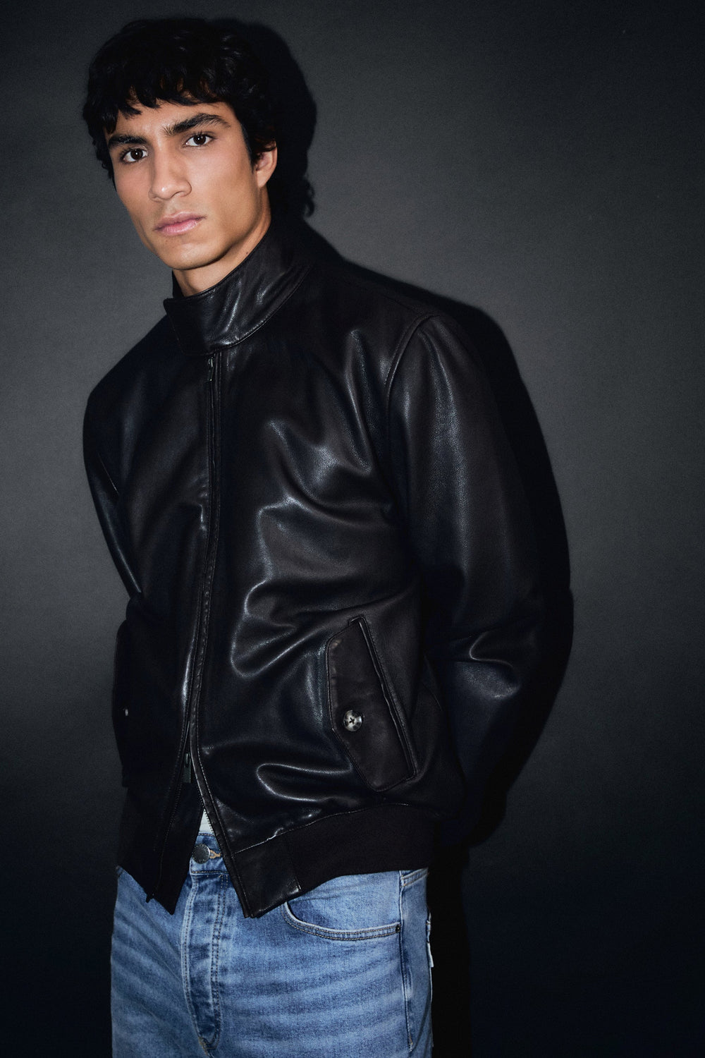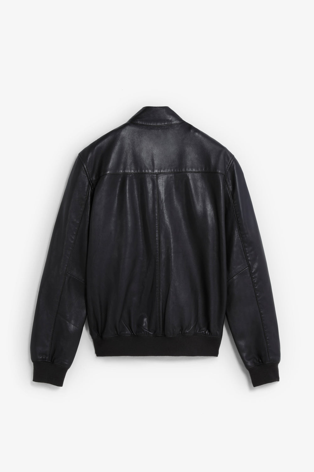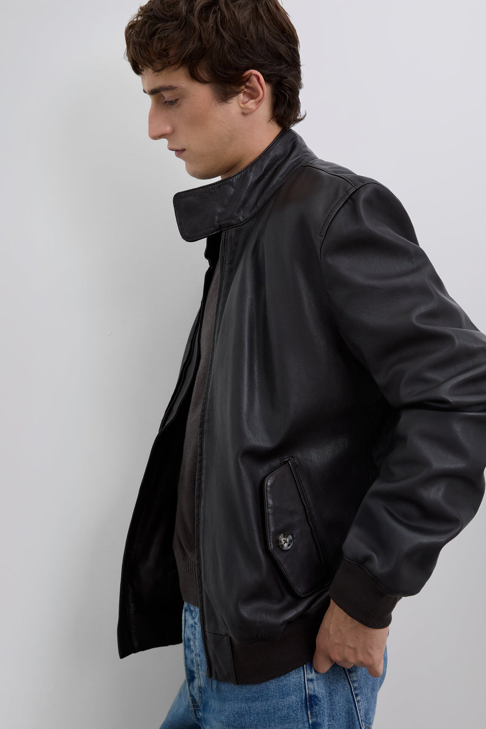 Jacket made of 100% leather. Long sleeves. Front double slider zip fastening. Raised collar with double clasp fastening. Two front pockets with flap and button. Ribbed cuffs and hem.