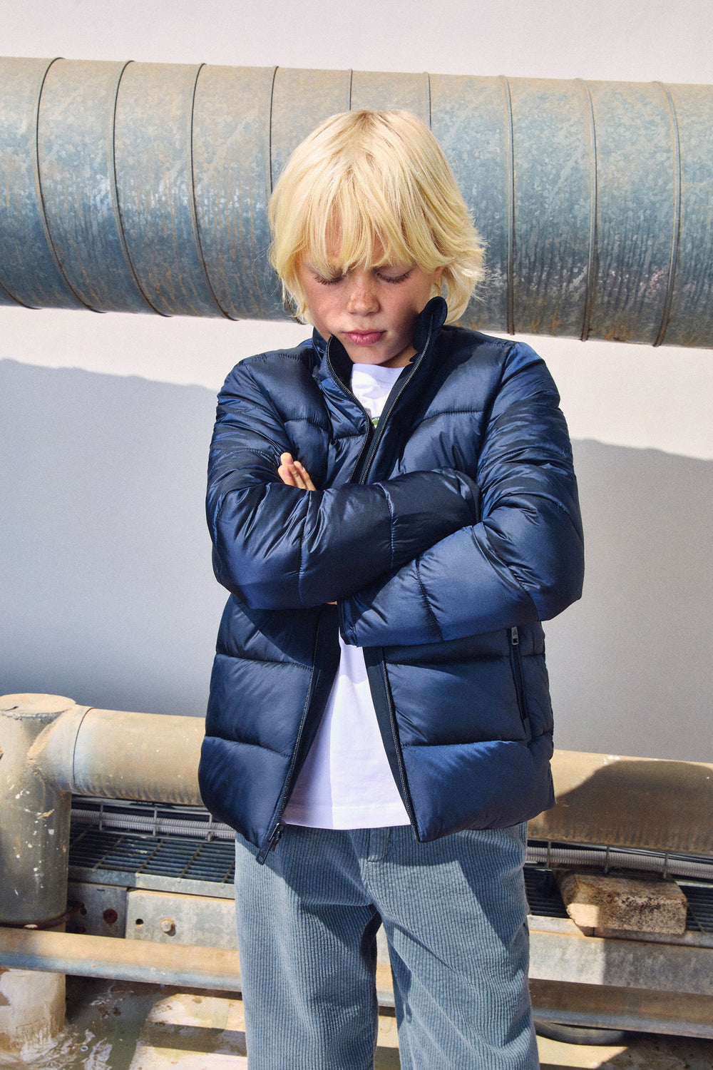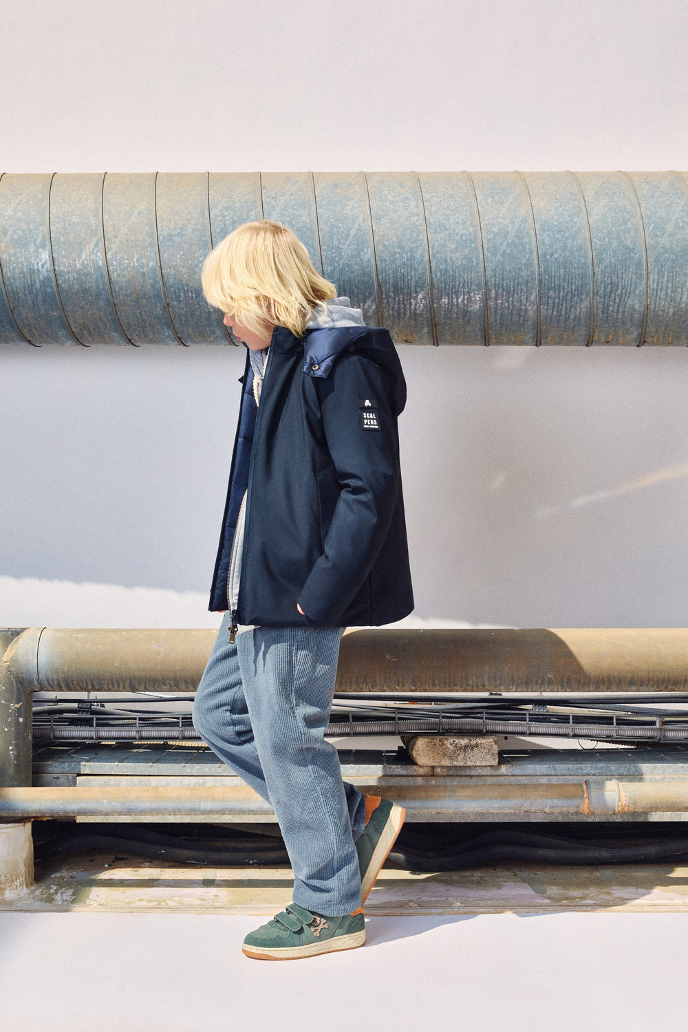 Jacket with detachable hood with button fastening. Long sleeves. Double slider thermo-sealed zip. Two front pockets. Rubber logo patch detail and skull on the sleeve.