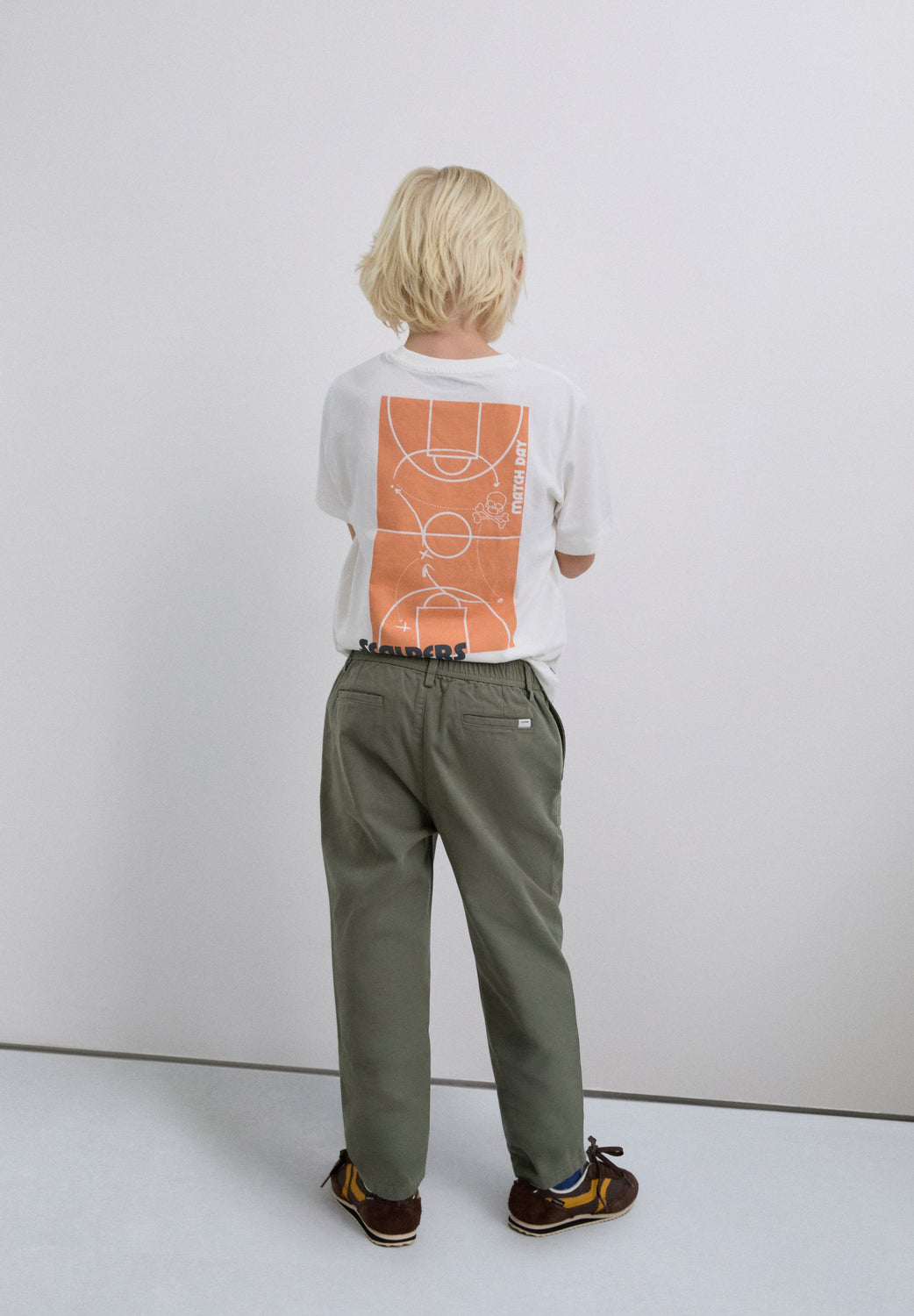 Chino trousers made of 100% BCI cotton. Two front and back pockets. Button fastening and belt loops. Logo label detail on the pocket.