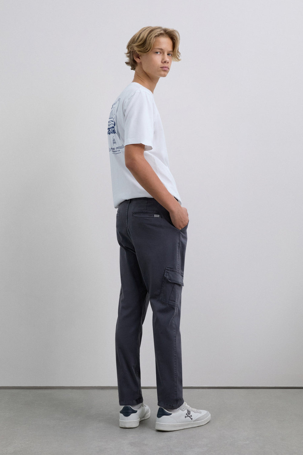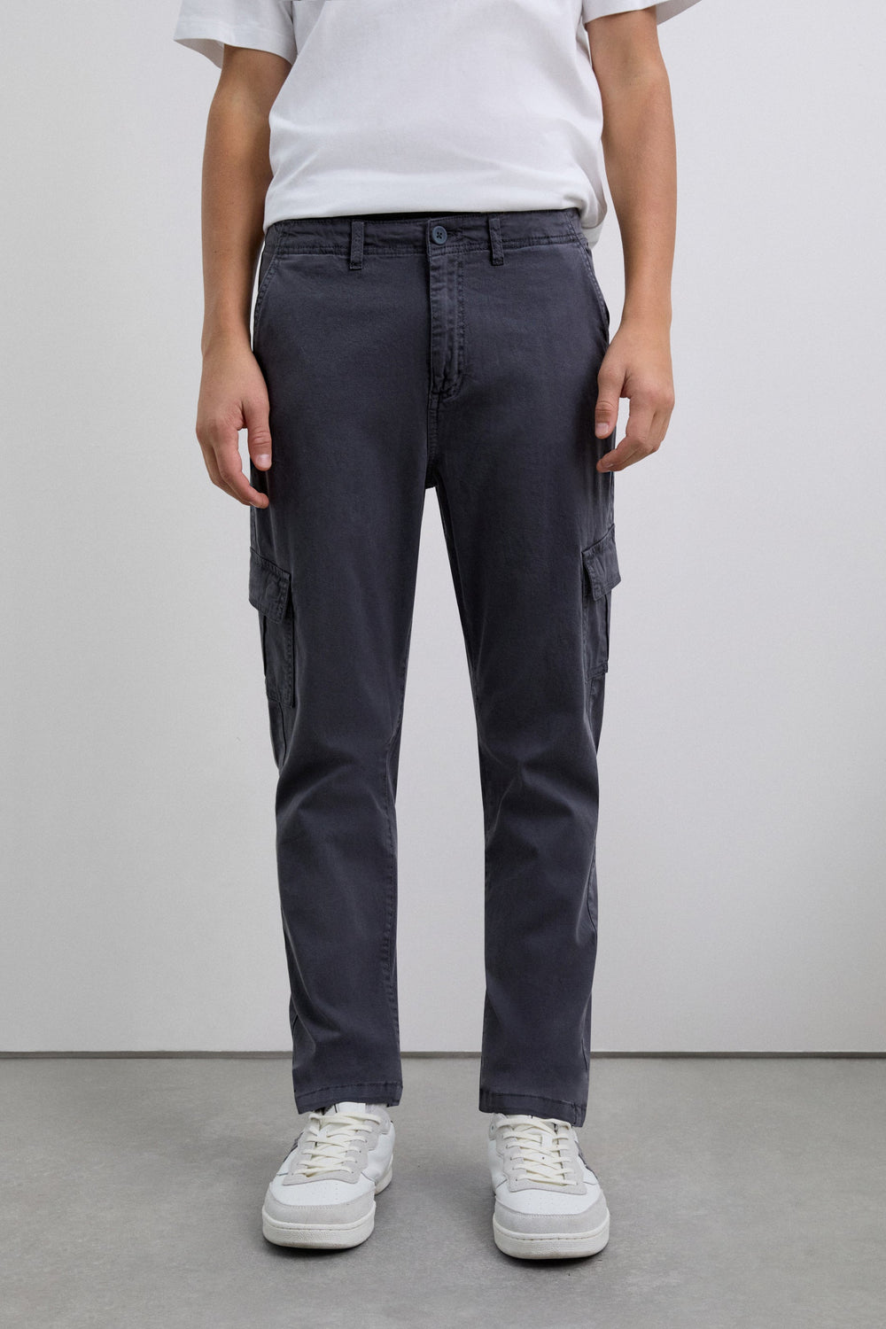 Pantalón cargo confeccionado en algodón BCI ligeramente elástico. Regular fit, cierre con botón y cremallera y bolsillos laterales. Trabillas en cintura y bolsillos en pernera con tapeta.