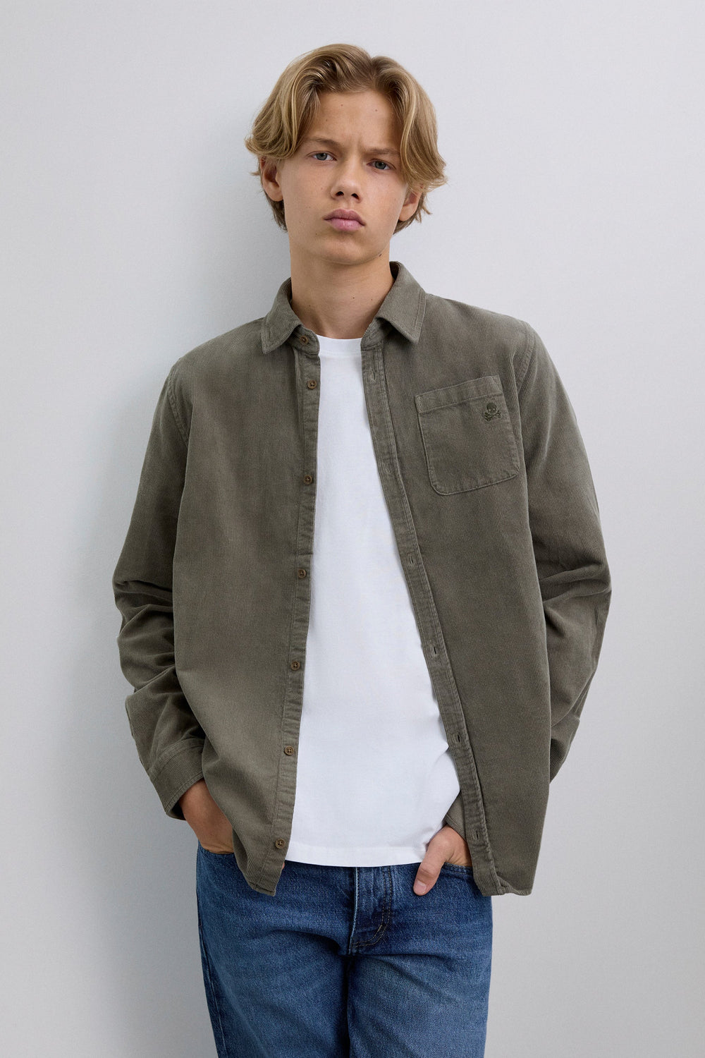 Corduroy shirt made of 100% BCI cotton. Regular Fit. Button fastening. Long sleeves with buttoned cuffs. Matching embroidered skull on the chest.