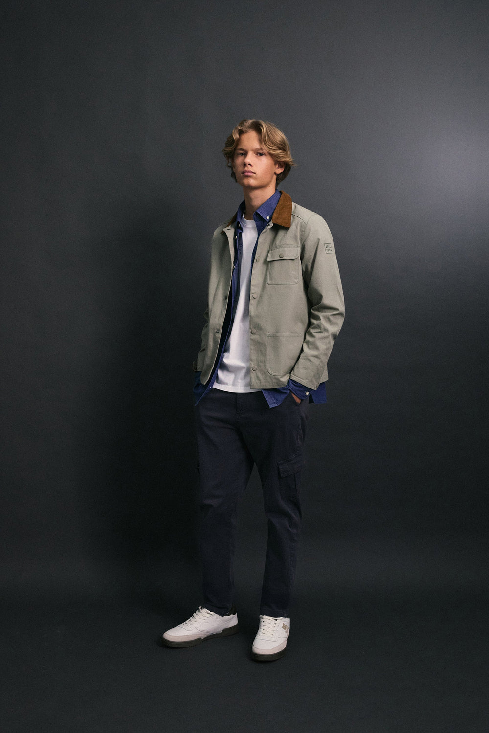 Chaqueta confeccionada en 100% algodón BCI. Cuello camisero a contraste. Manga larga. Cierre mediante botón y cremallera. Bolsillos frontales y en pecho con cierre mediante botón. Detalle de etiqueta con logo en bolsillo frontal.