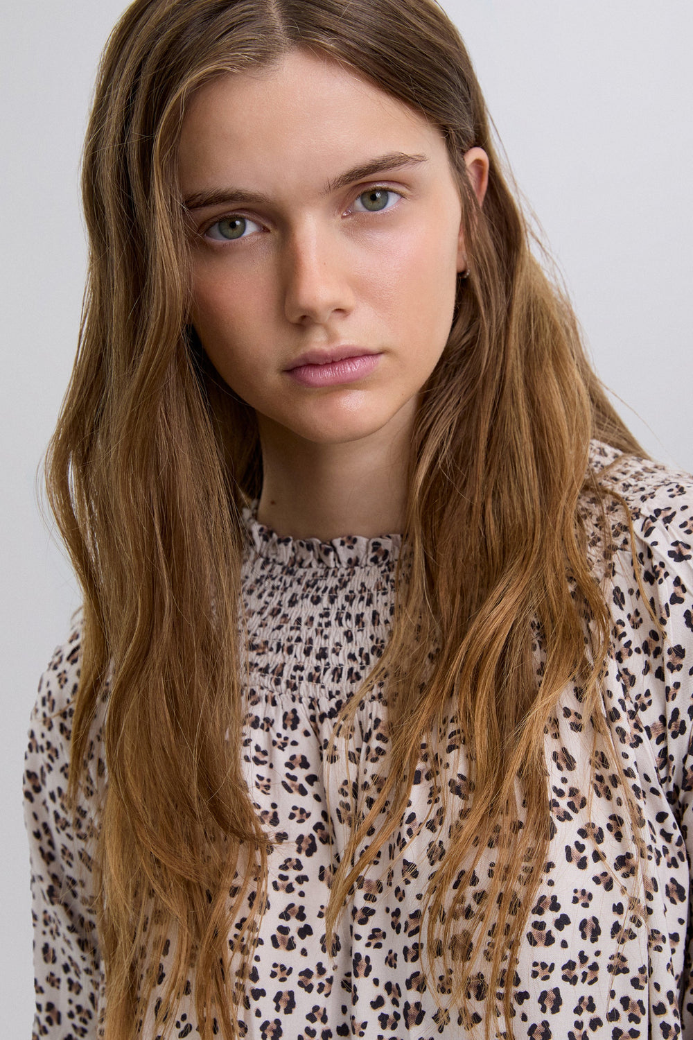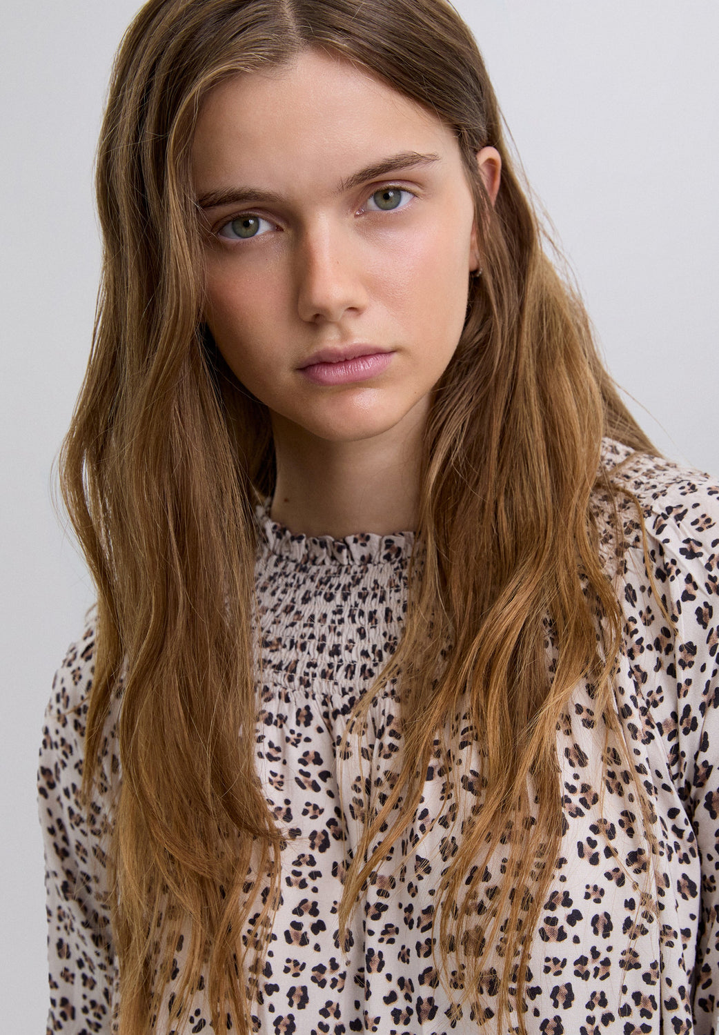 Animal print dress. Slightly puffed long sleeves. Smocking collar and button fastening.