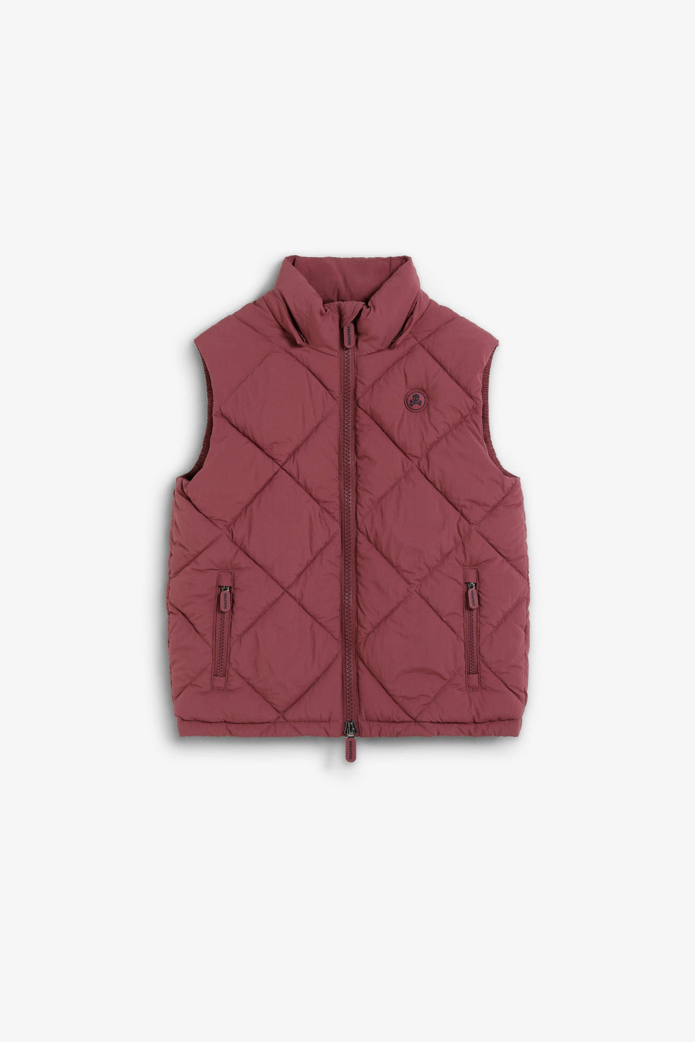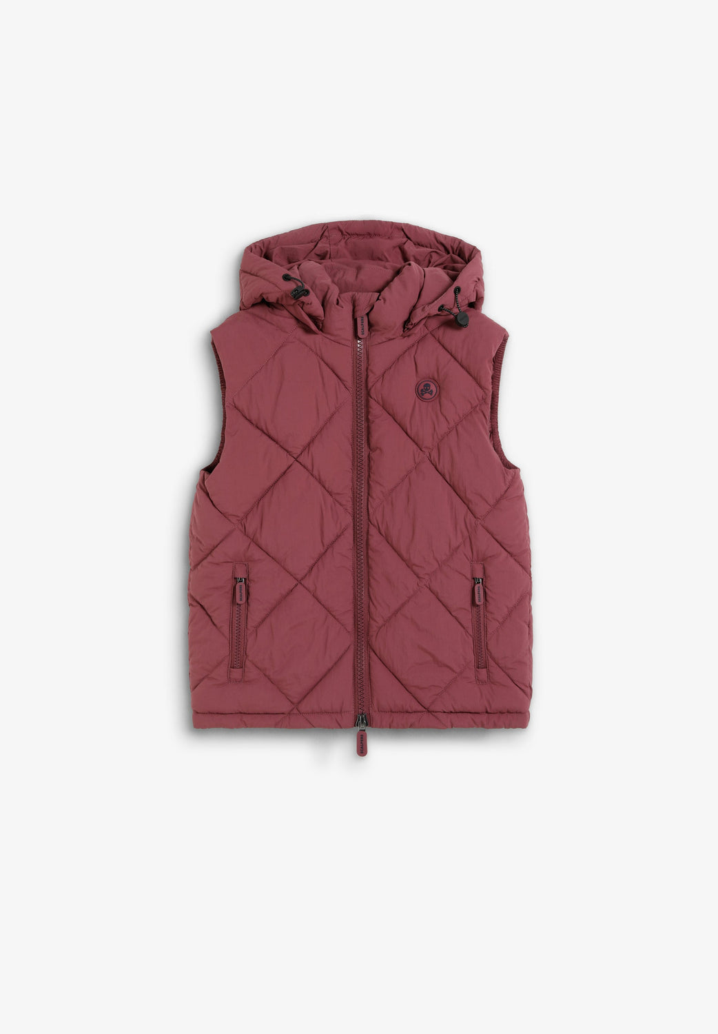 Chaleco resistente acolchado con capucha ajustable. Cierre con cremallera de doble carro. Detalle calavera engomada en pecho. Bolsillos con cremallera y bolsillo interior