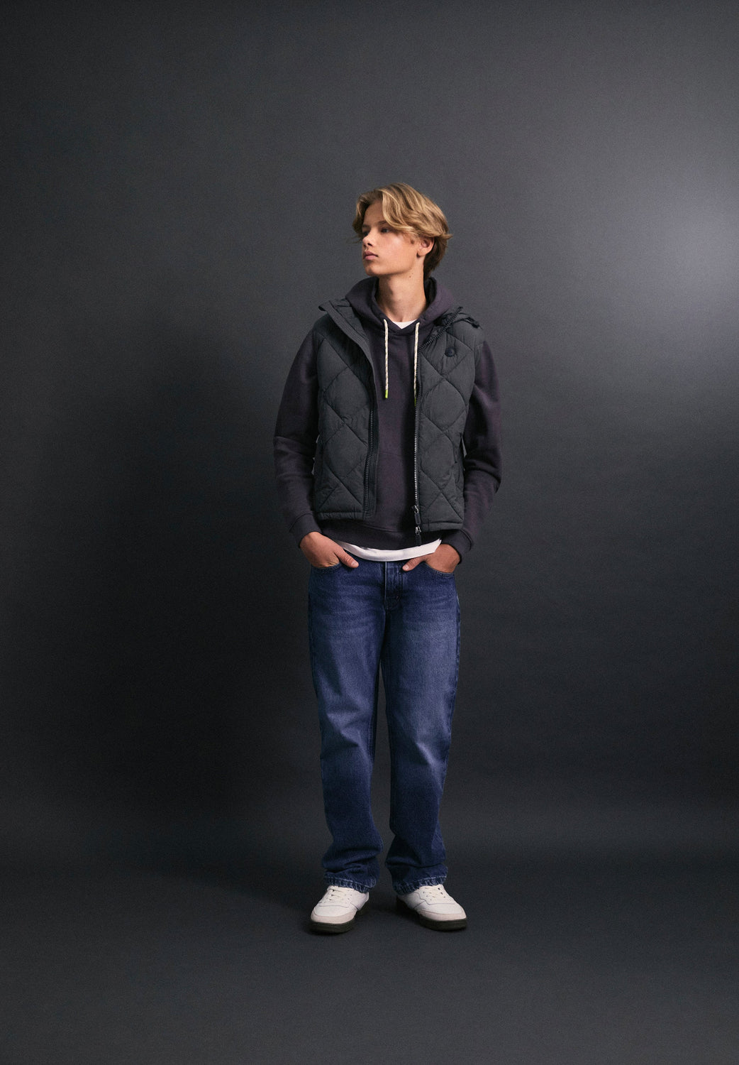 Chaleco resistente acolchado con capucha ajustable. Cierre con cremallera de doble carro. Detalle calavera engomada en pecho. Bolsillos con cremallera y bolsillo interior