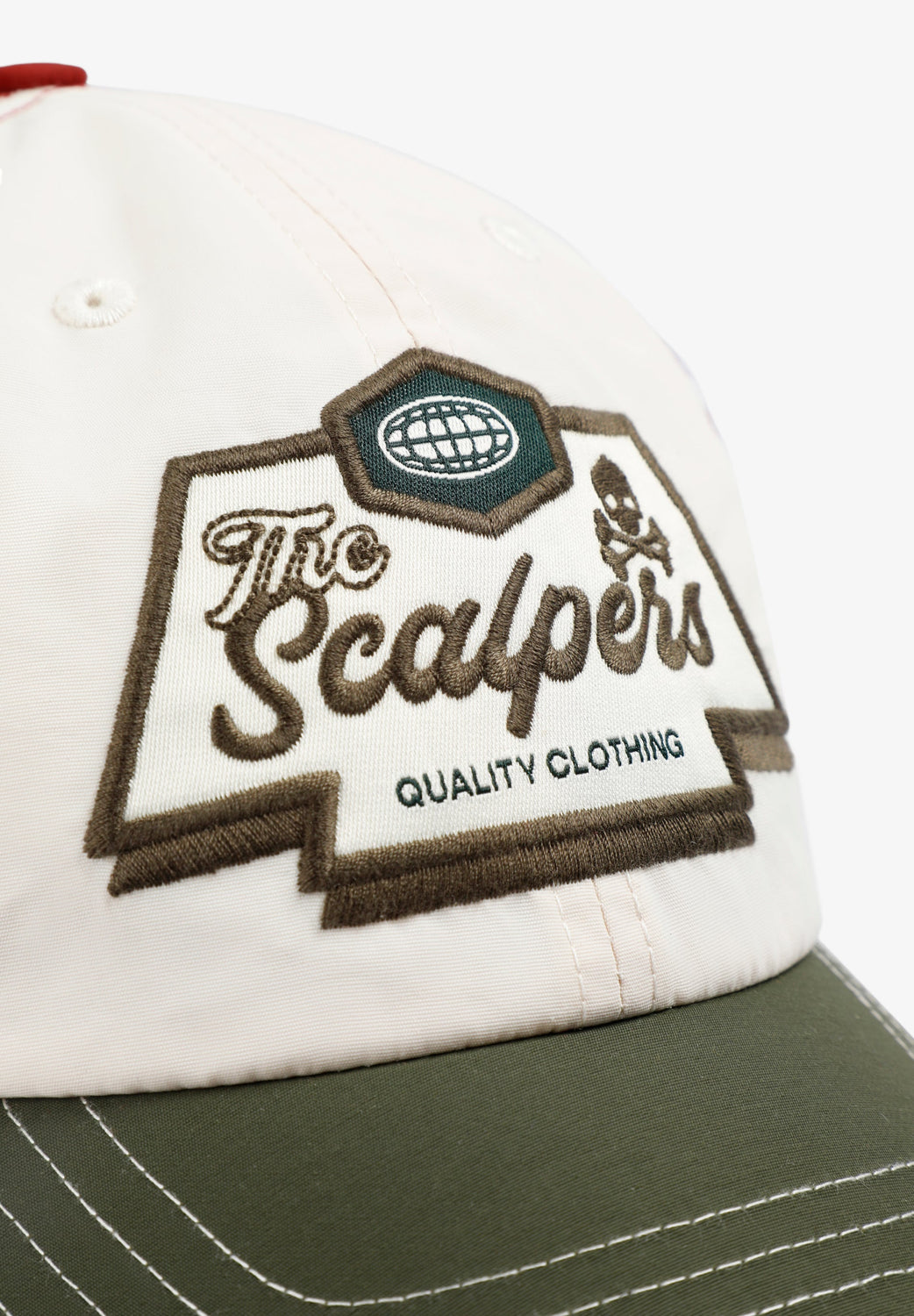 Three-tone cap made of nylon. Adjustable back and front embroidery with contrast logo and skull. Logo label detail at the back.