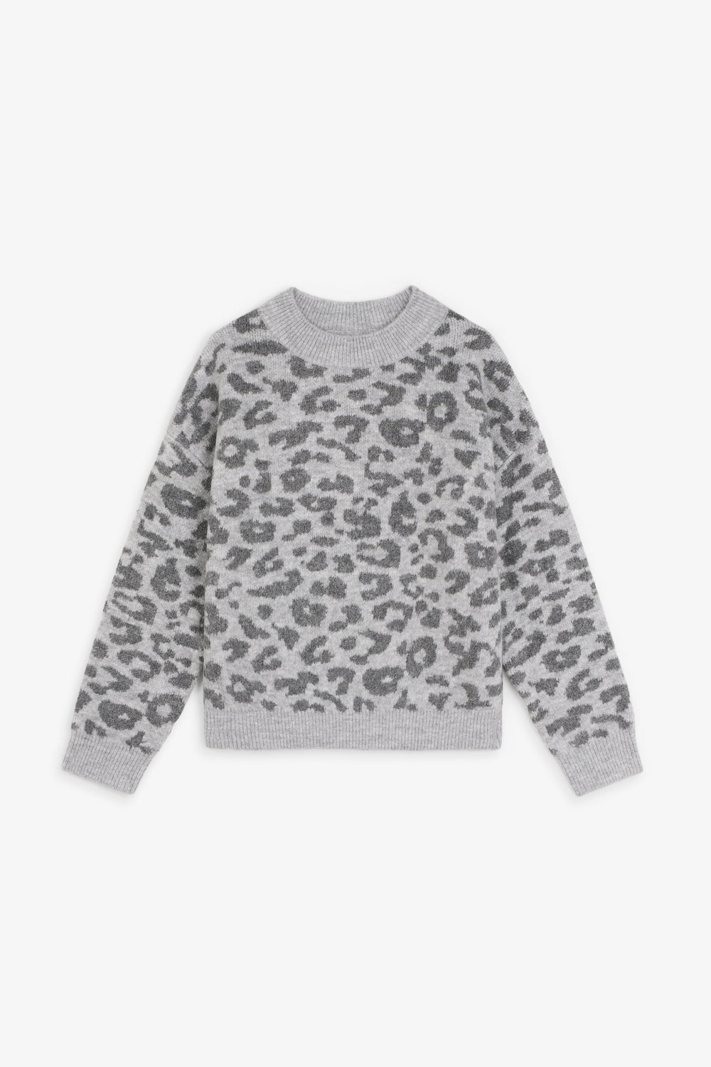 Knit sweater. Long sleeves. Round neck. Animal print. Contrast ribbed finish.