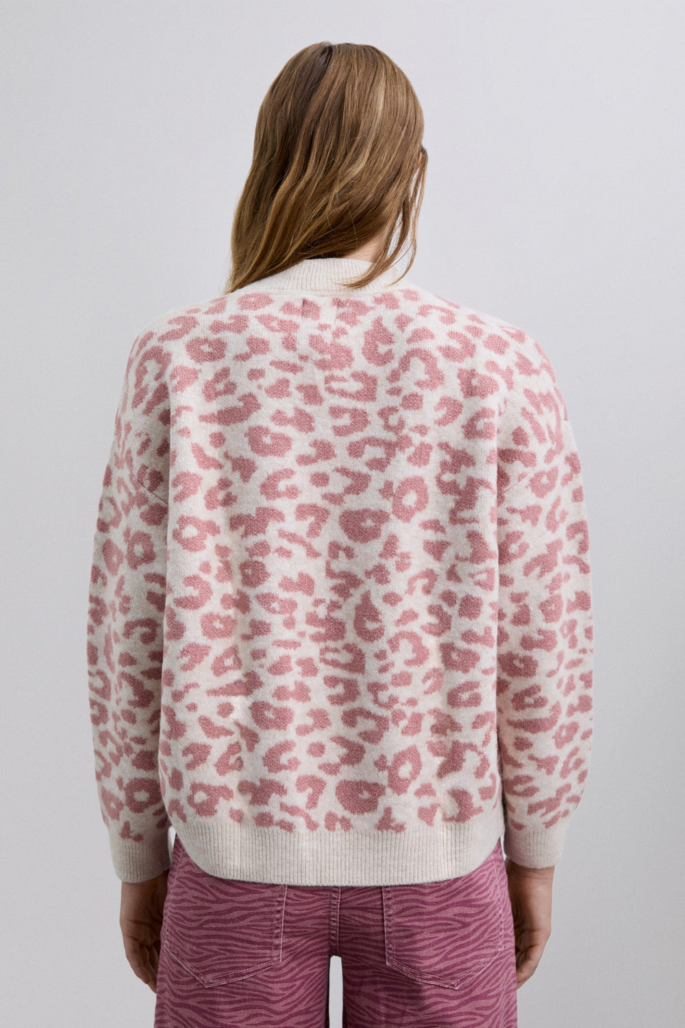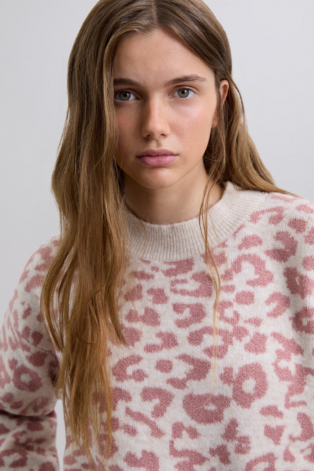 Knit sweater. Long sleeves. Round neck. Animal print. Contrast ribbed finish.