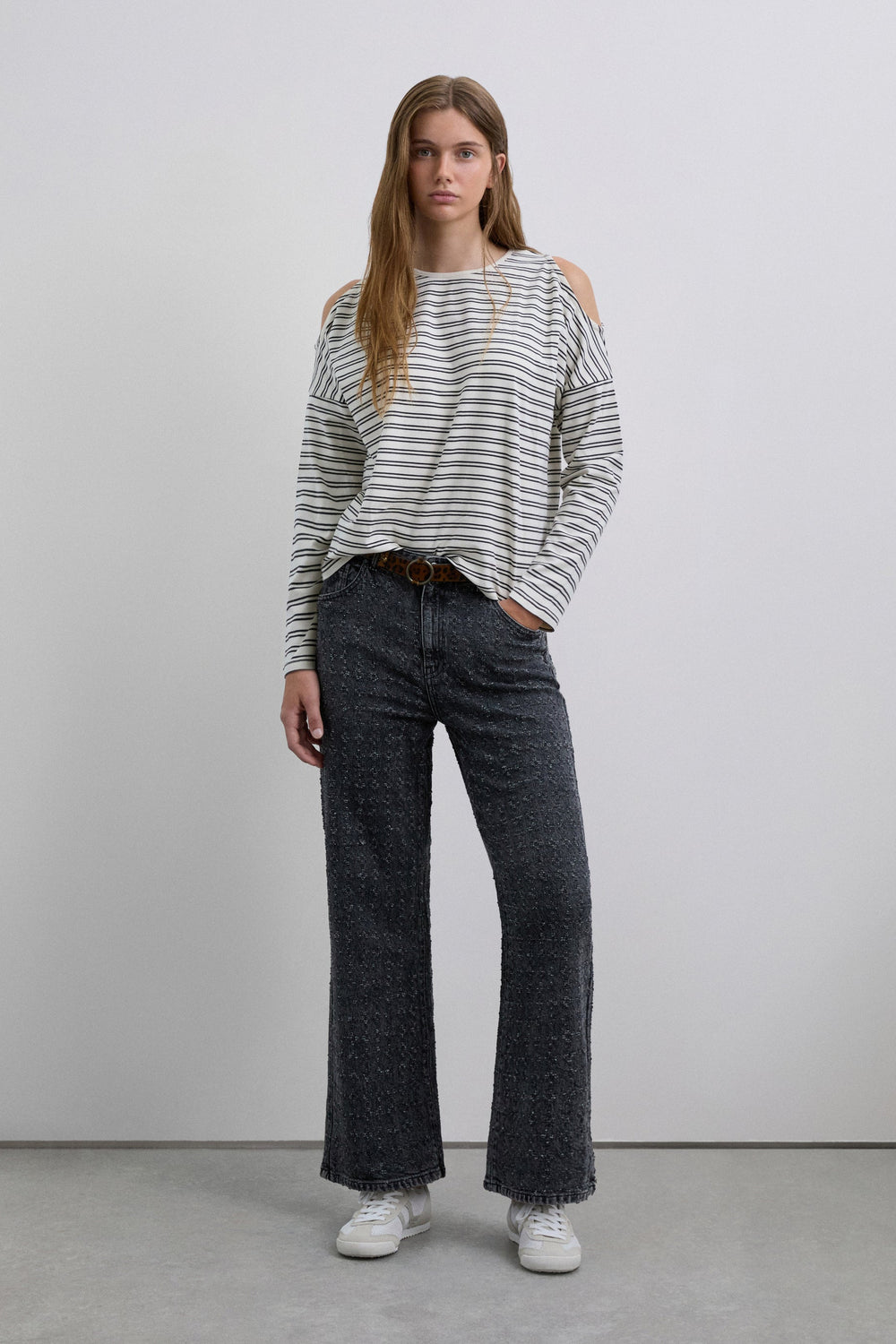 T-shirt made of BCI cotton. Regular Fit. Stripe print. Round neck. Long sleeve with opening at the shoulders. Studded skull detail on the back.