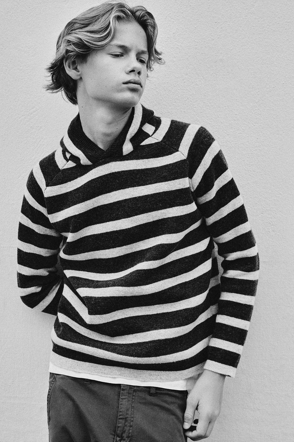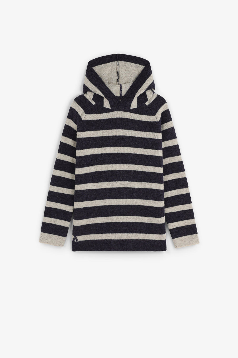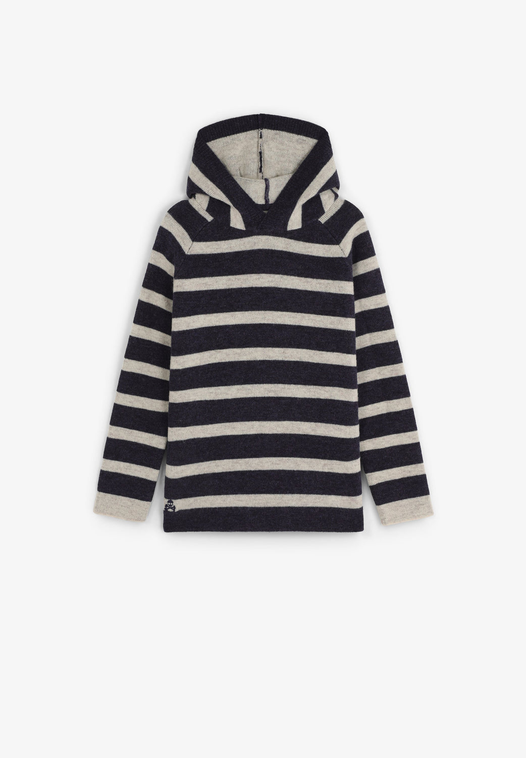 Jersey de punto con capucha. Estampado de rayas. Manga larga. Calavera bordada a contraste en cintura.