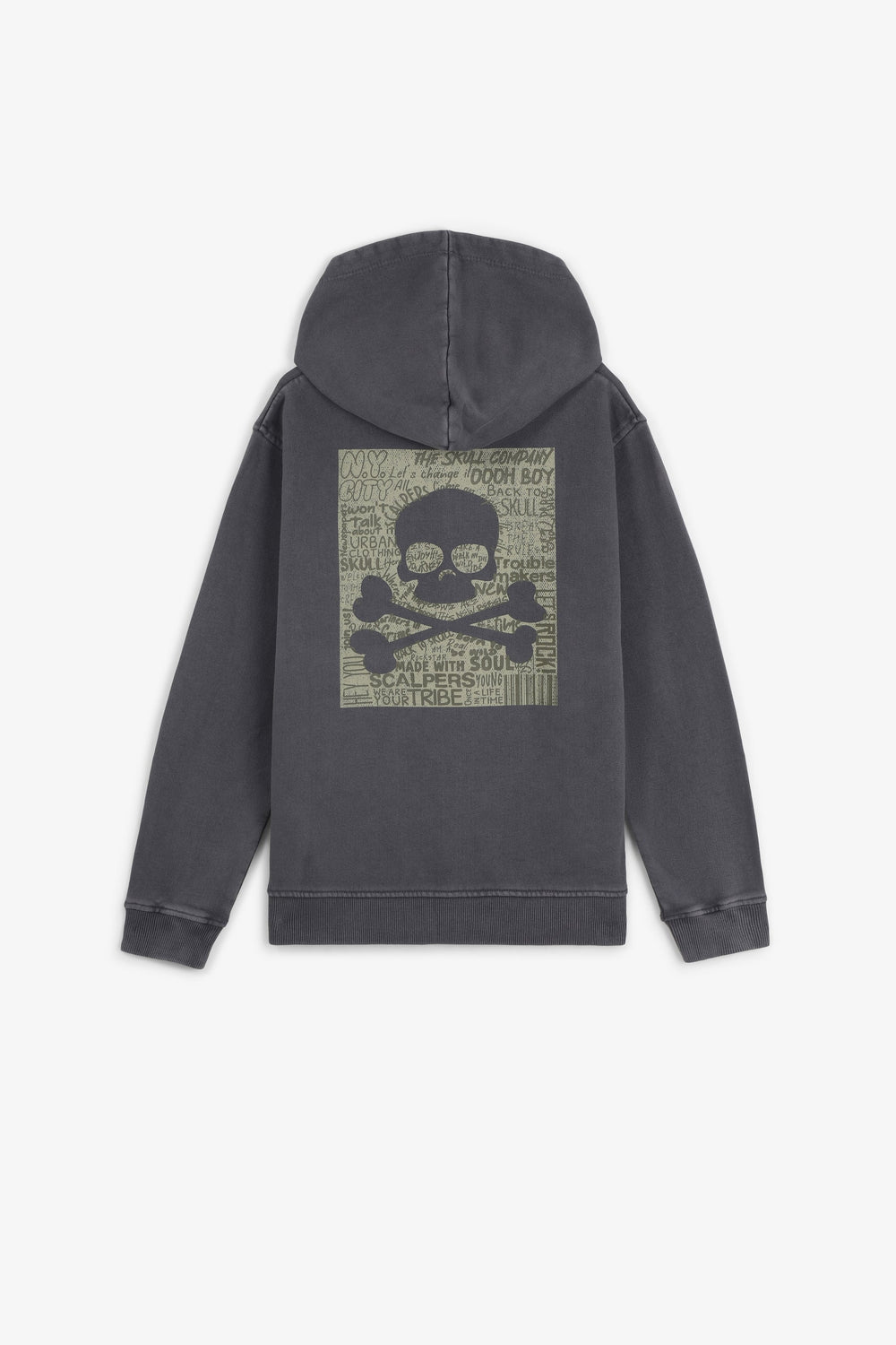 Sudadera con capucha confeccionada en 100% algodón BCI. Print en pecho y espalda. Manga larga con acabados en rib. Bolsillos tipo canguro en frontal. Detalle etiqueta calavera en cintura.