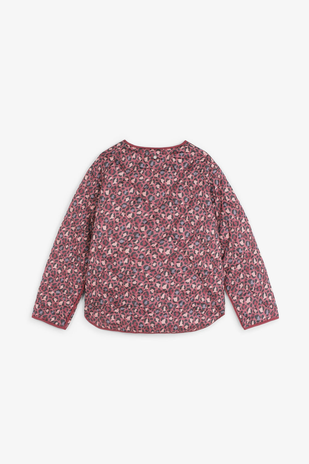 Puffer jacket made of a synthetic blend. Animal print. Button fastening. Slightly V-neck. Long sleeves. Two front pockets.