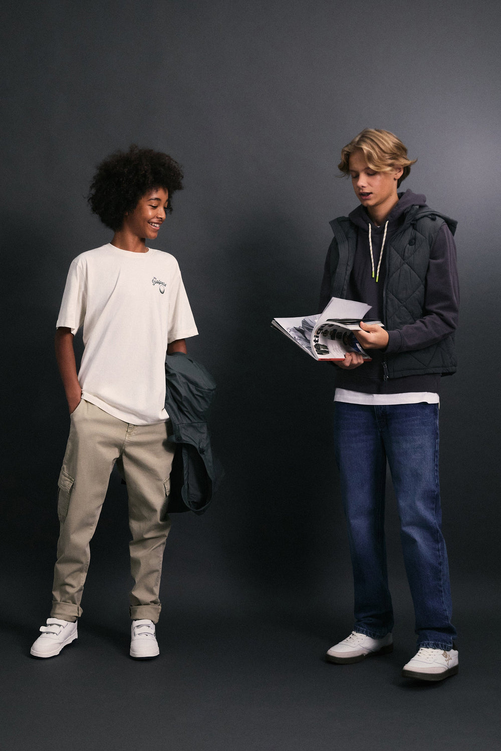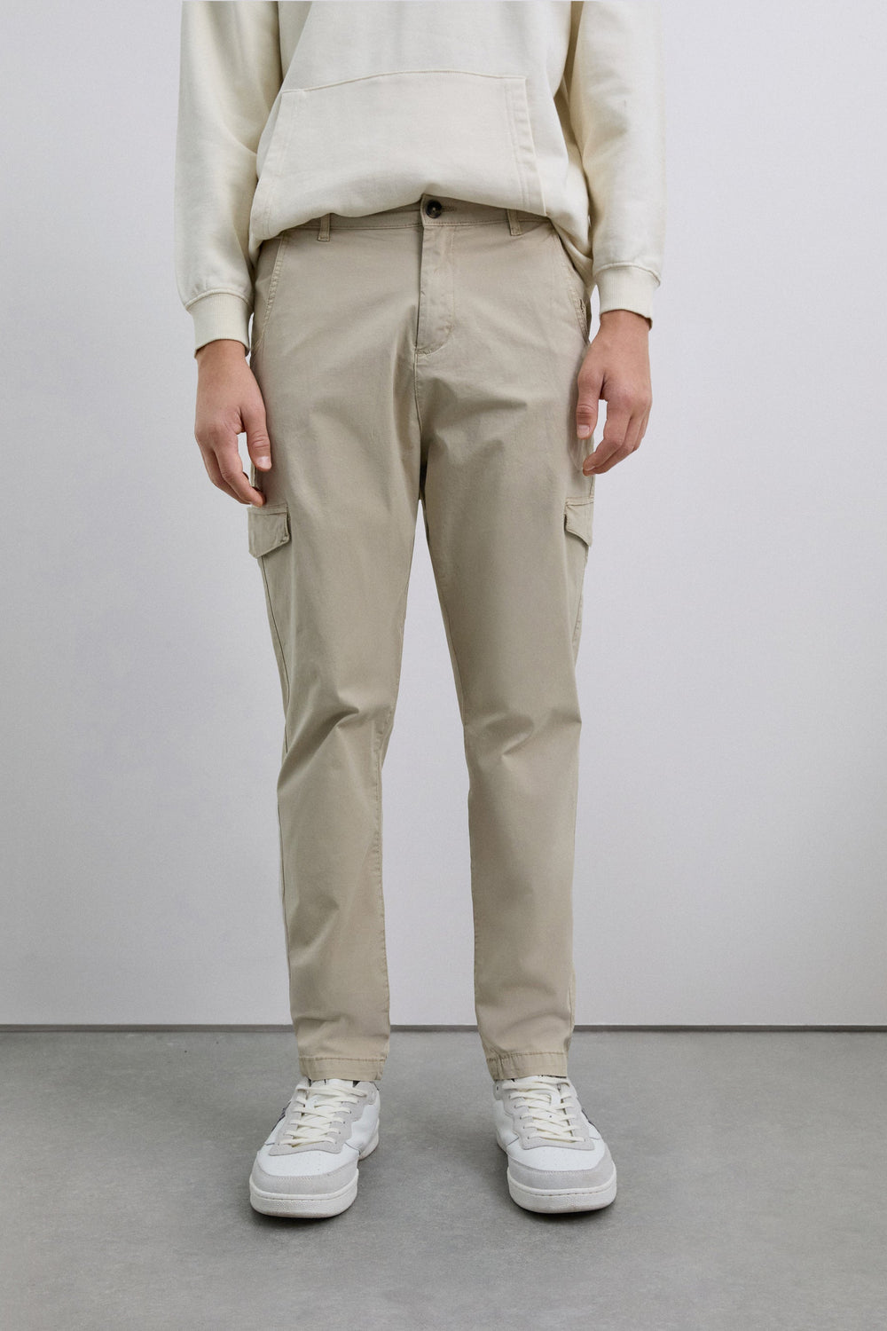 Cargo trousers made of slightly stretch BCI cotton. Regular fit. Button and zip fastening. Front and back pockets. Belt loops at the waist and flap pockets on the leg.