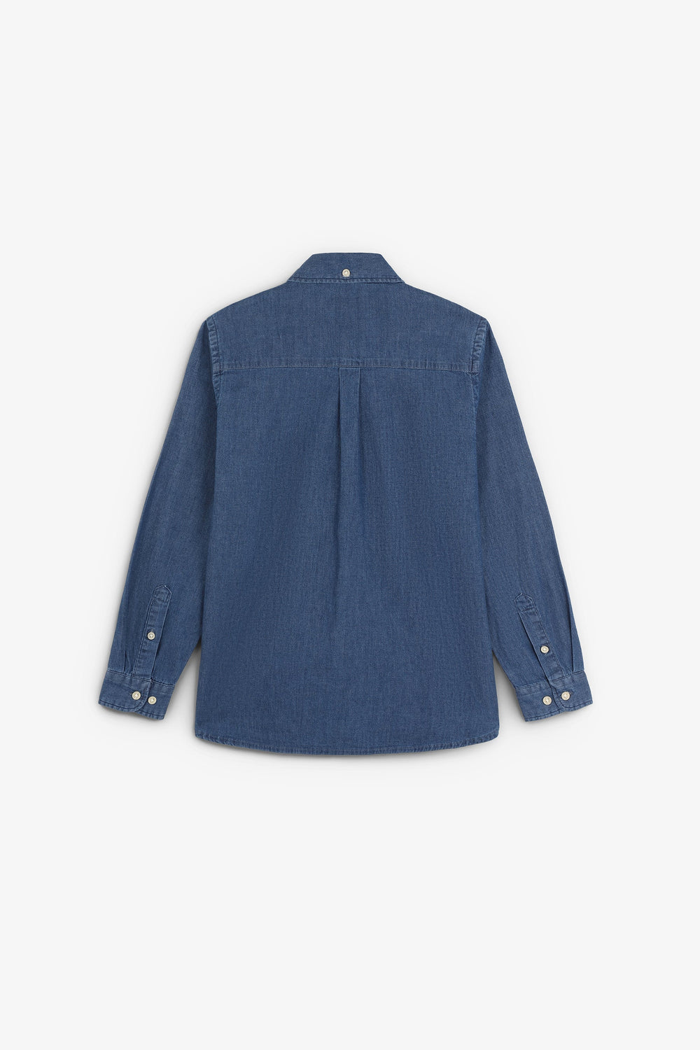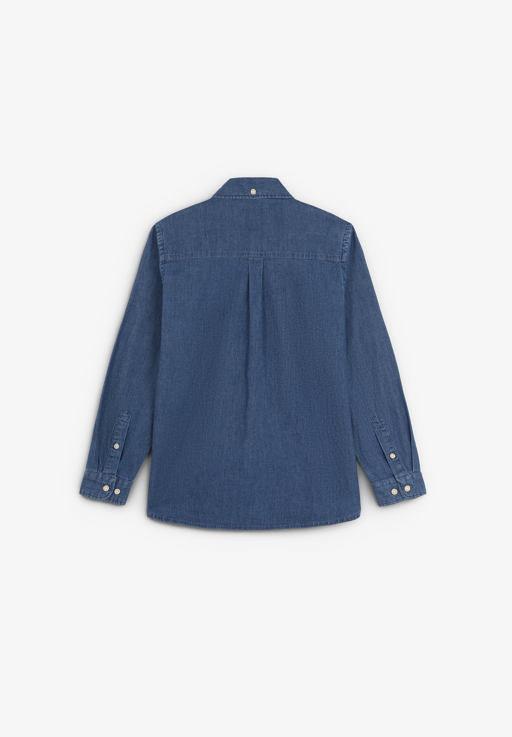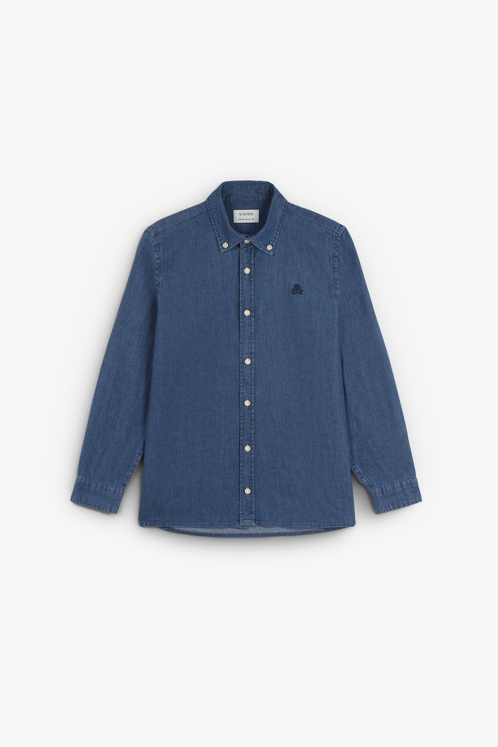 Camisa Oxford confeccionada en algodón BCI. Denim. Regular Fit. Cuello clásico y cierre con botones. Manga larga con puños terminados mediante botón. Calavera bordada en pecho a contraste.
