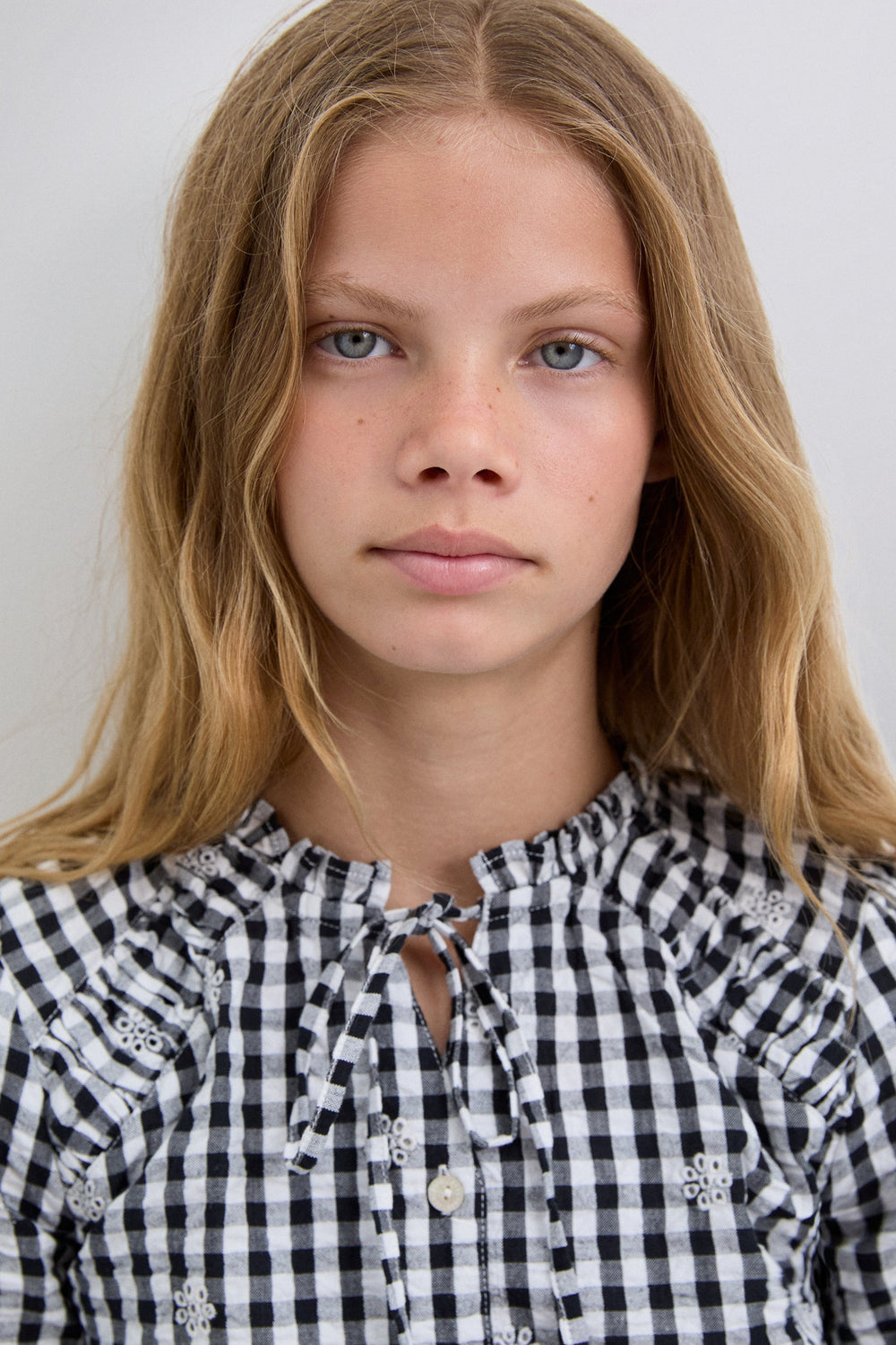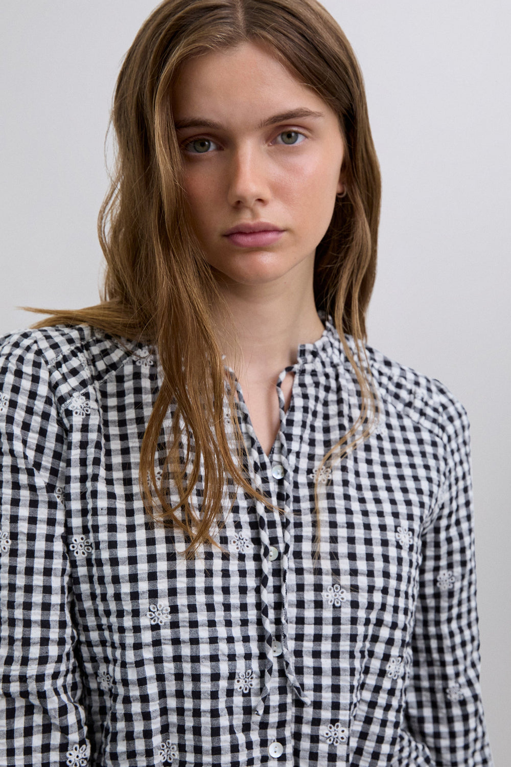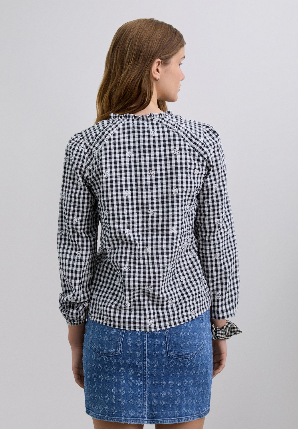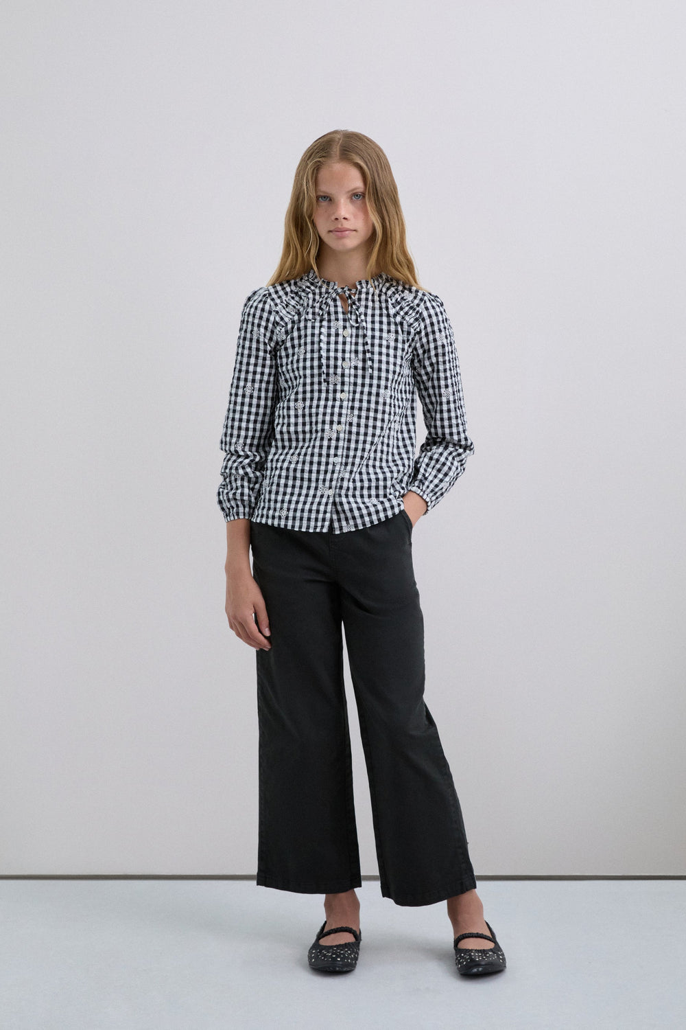 Shirt made of 100% BCI cotton. Long sleeves. Adjustable front tie and button fastening. Embroidered details.