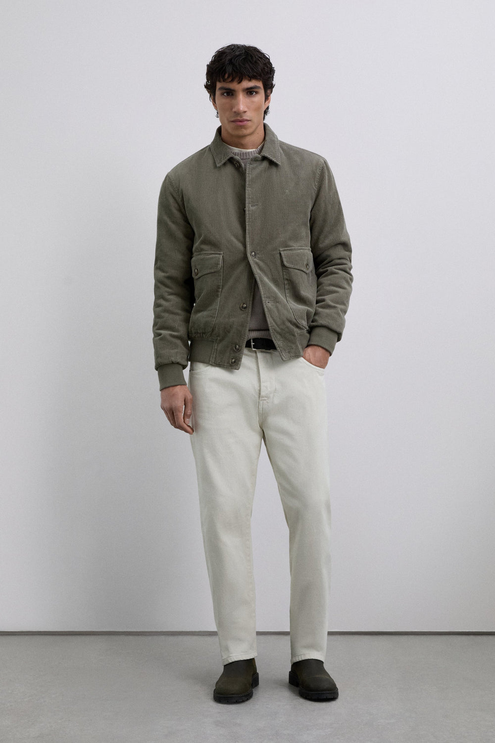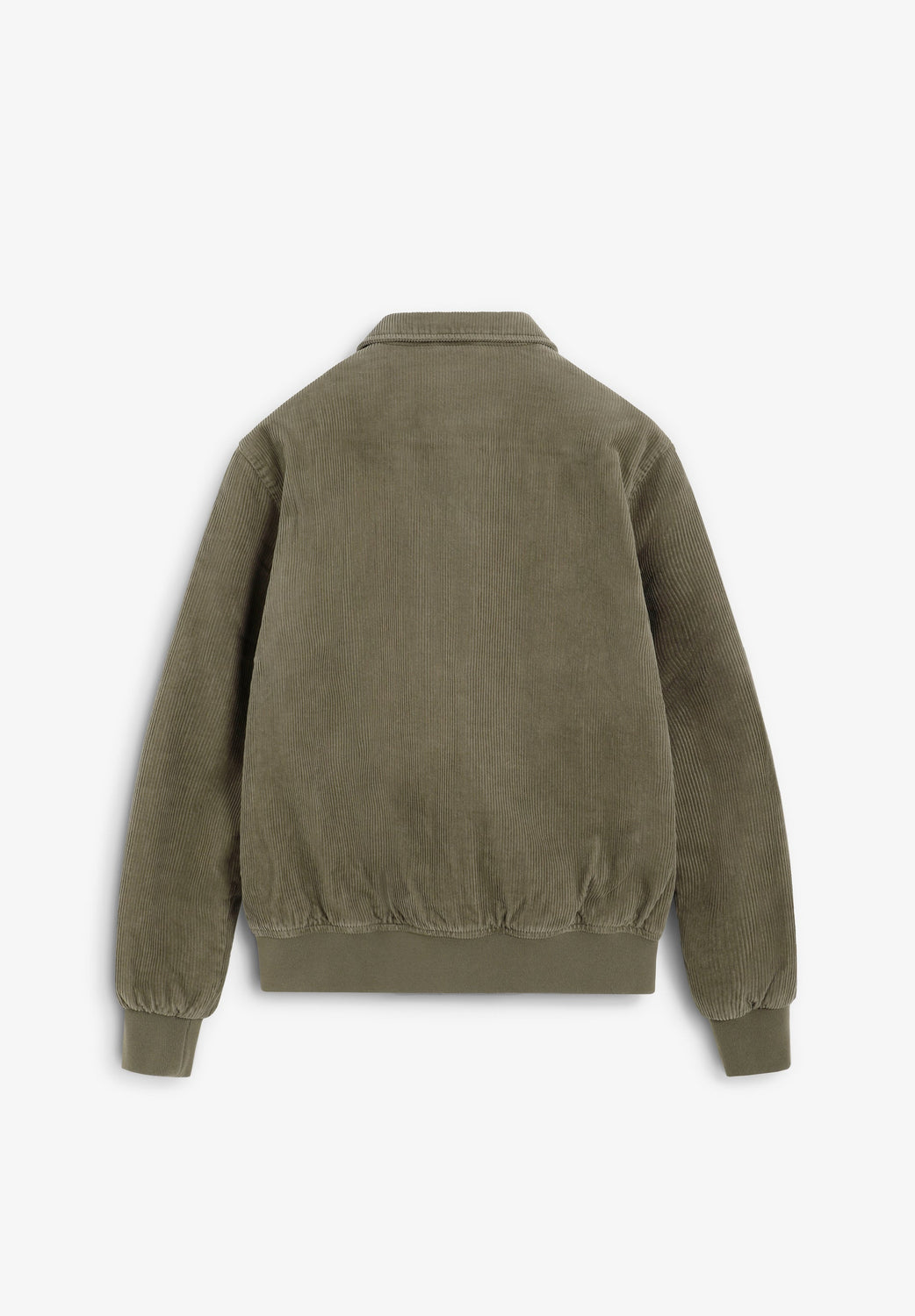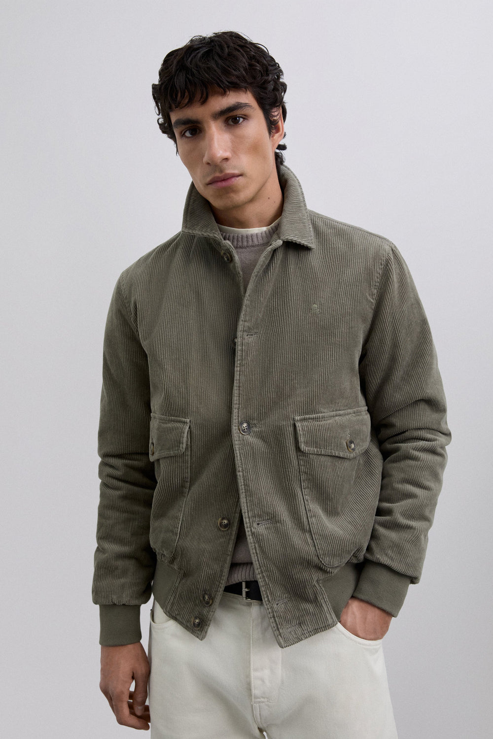 Corduroy bomber jacket made of 100% BCI cotton. Front button fastening. Double front pockets with button fastening. Ribbed cuffs and waistband. Matching embroidered logo detail on the chest.
