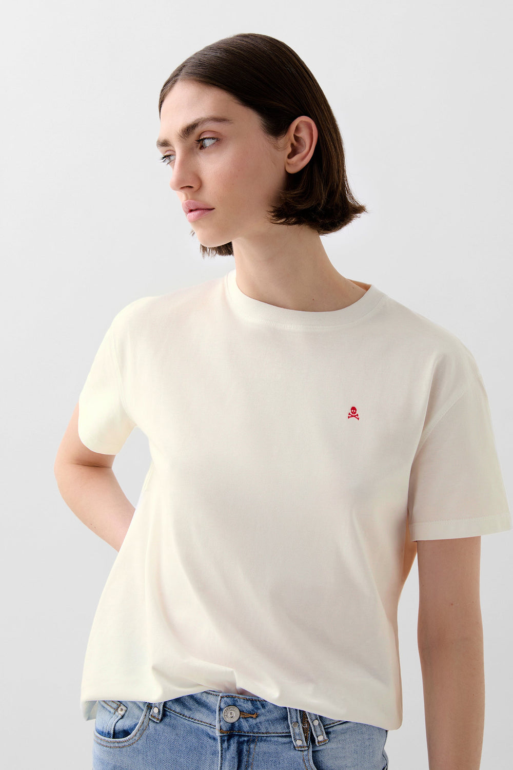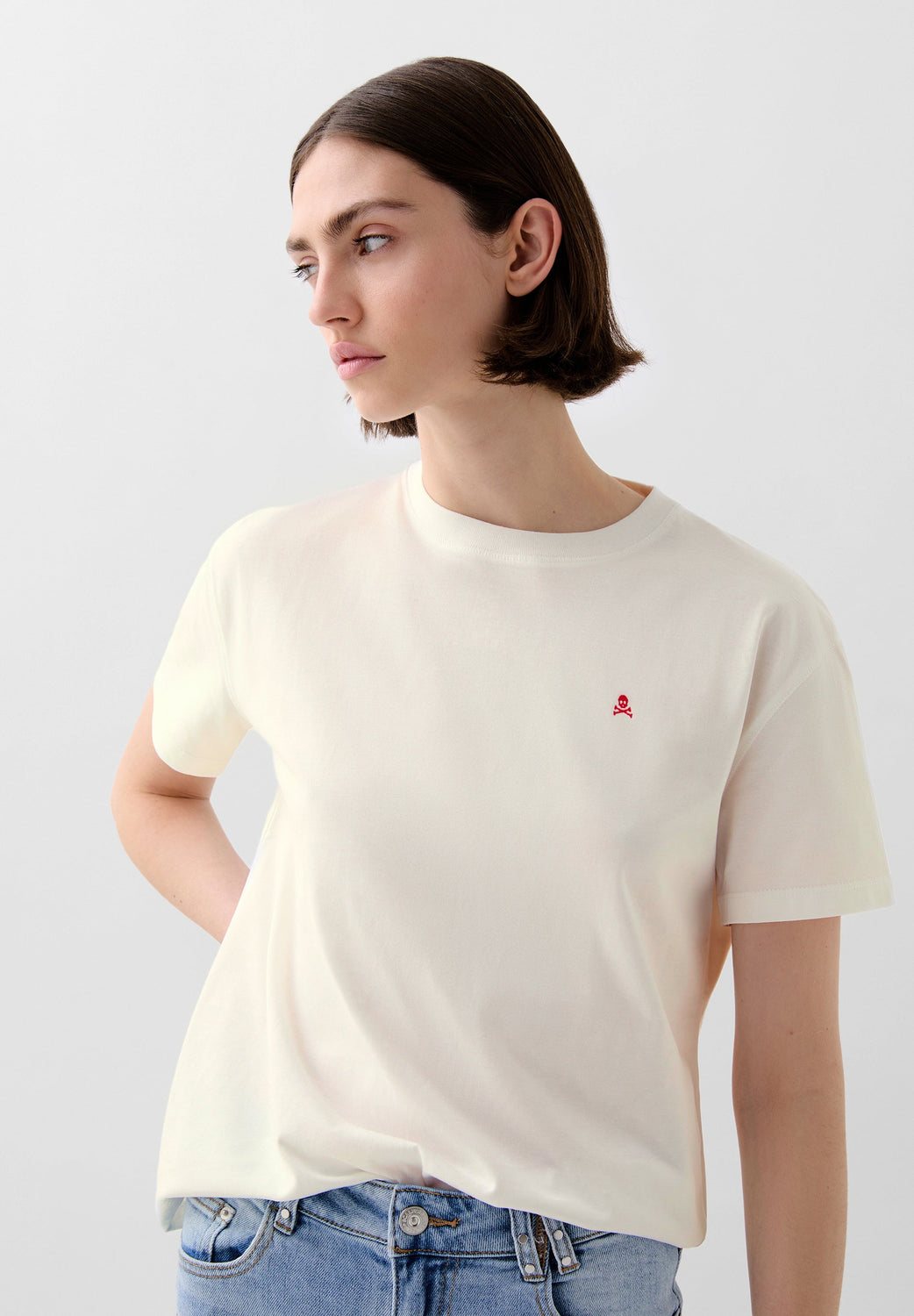 T-shirt with contrast front skull. Round neck, short sleeves.