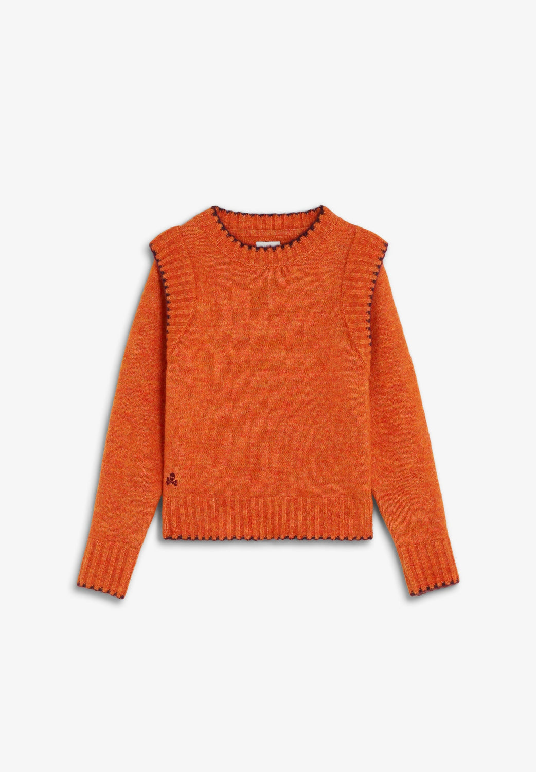Knit sweater. Round neck. Long sleeves. Contrast embroidered skull detail. Ribbed trim.
