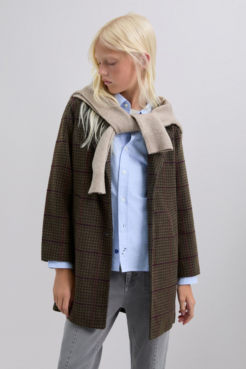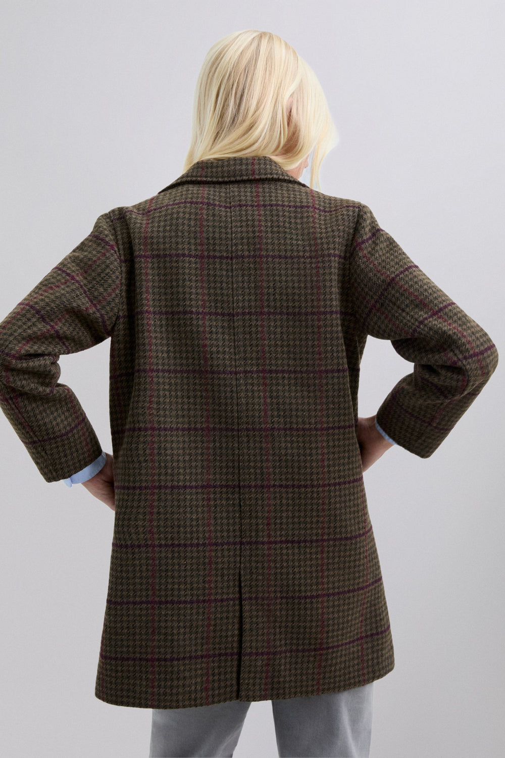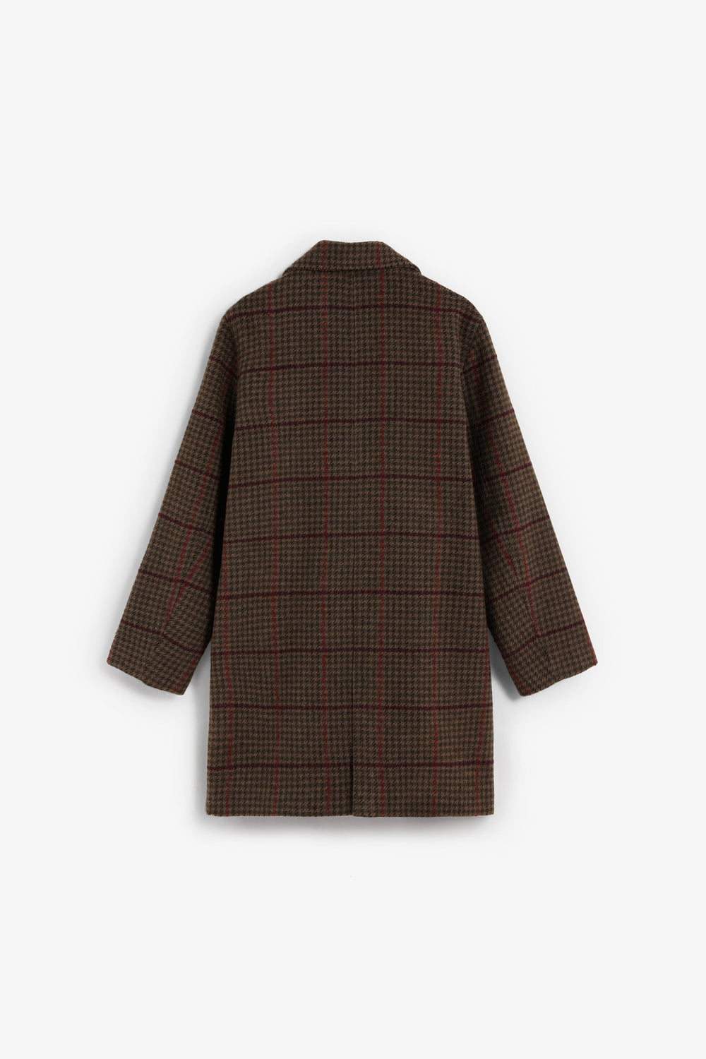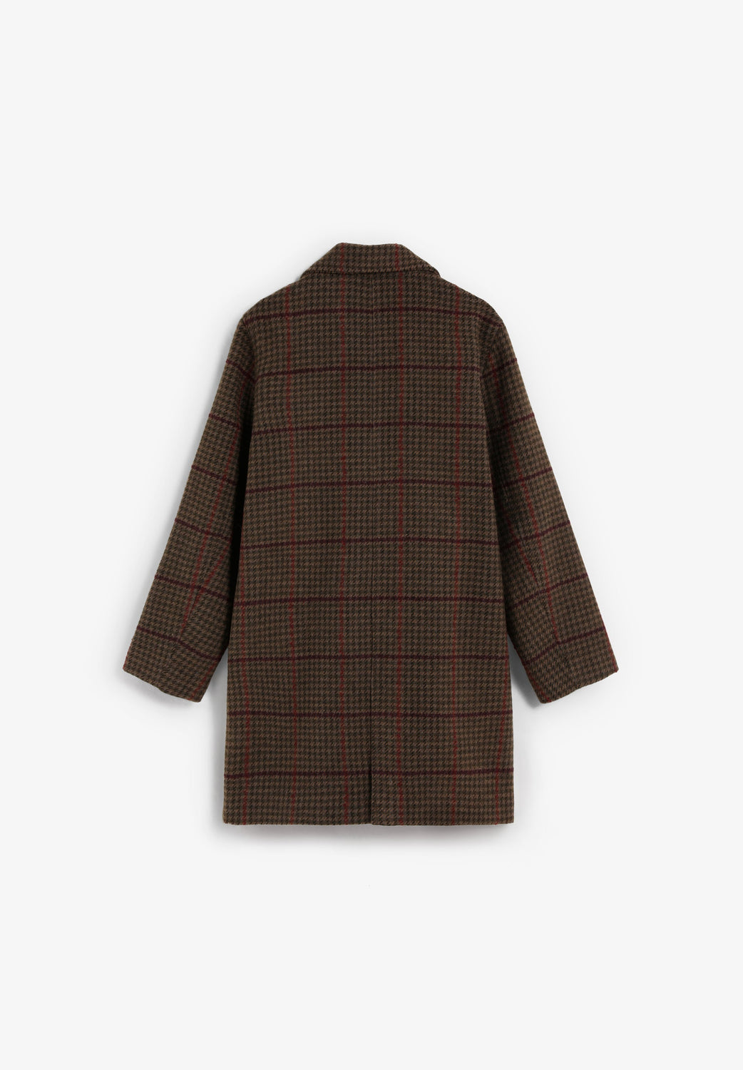 Checked cloth coat. Lapel collar. Button fastening. Long sleeves. Jetted flap pockets.