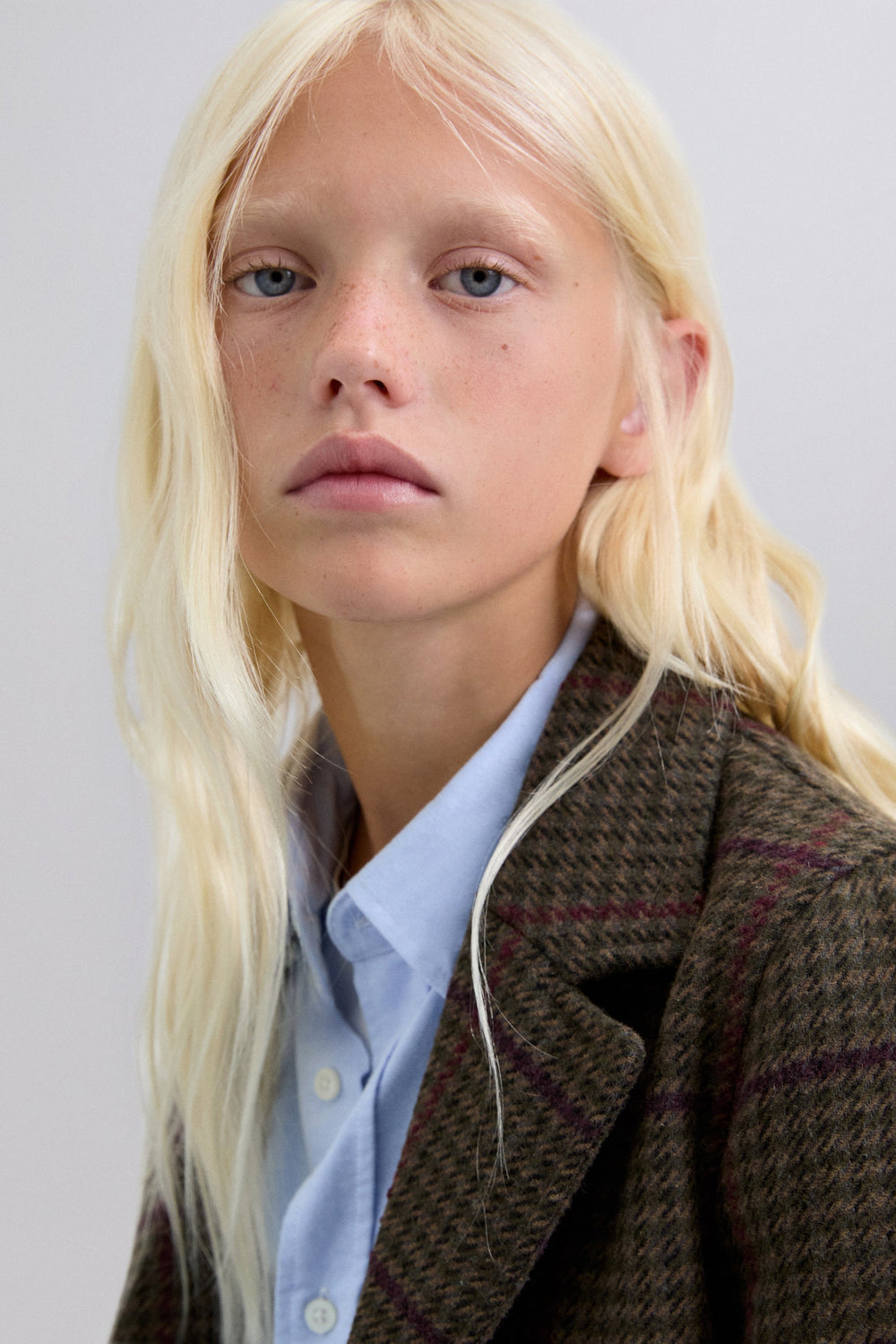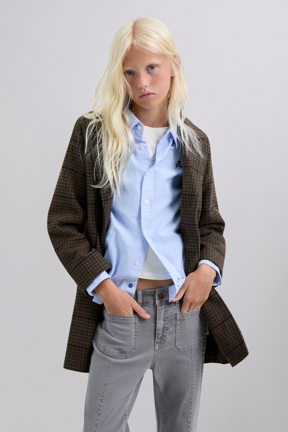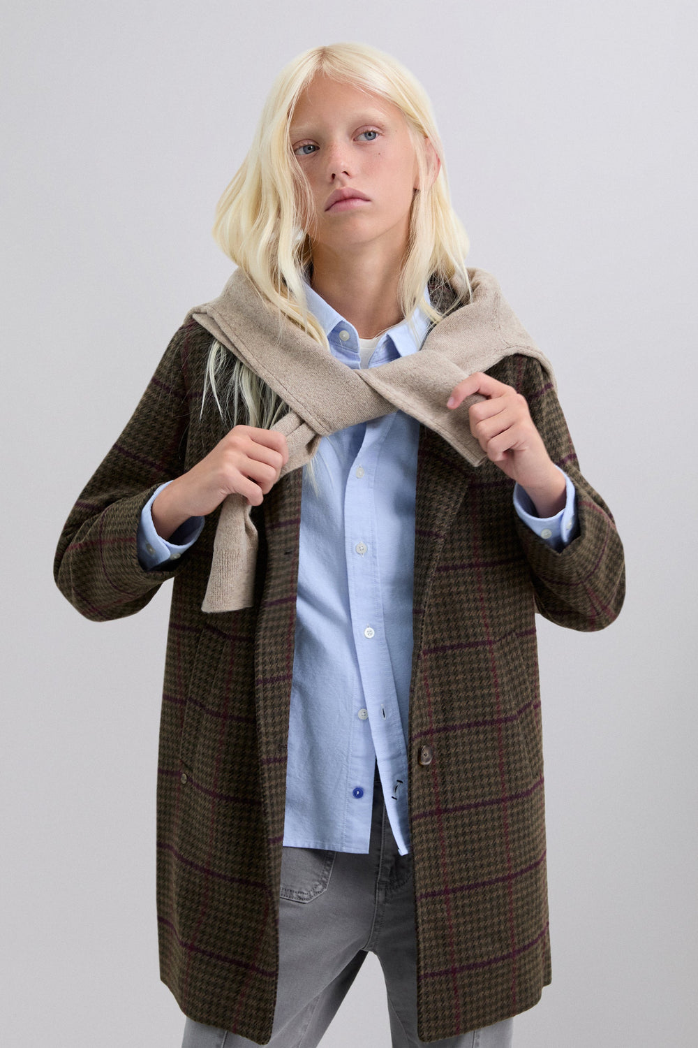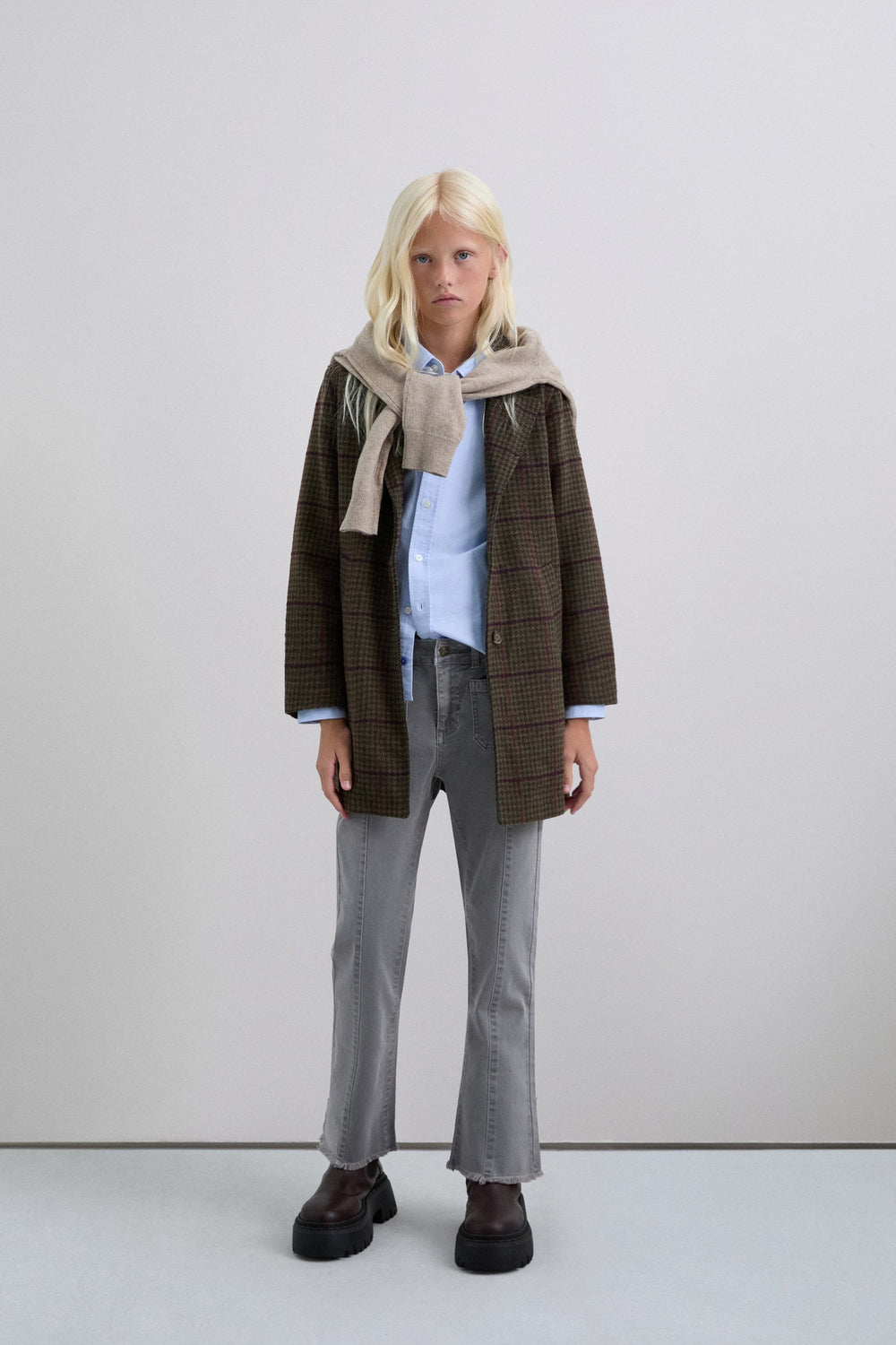 Checked cloth coat. Lapel collar. Button fastening. Long sleeves. Jetted flap pockets.