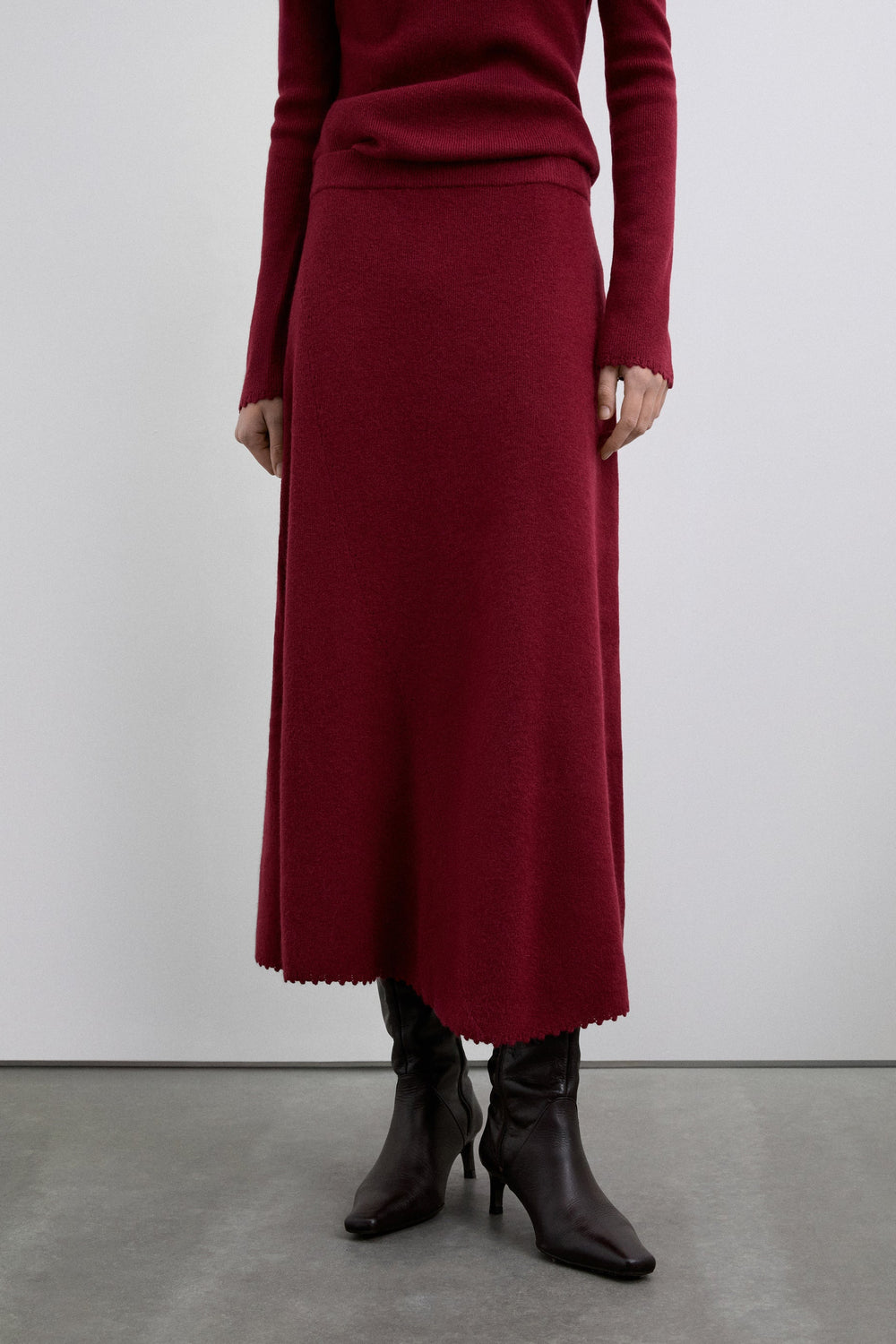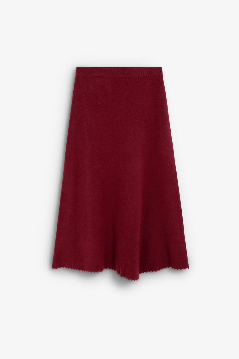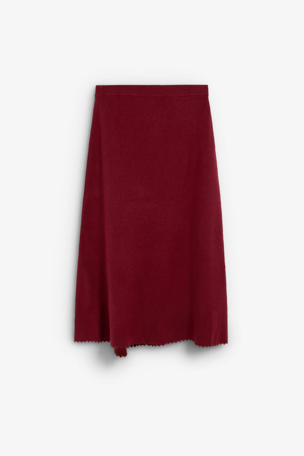 The skirt has an asymmetrical hem. It features a stitching detail along the skirt from the side to the hem. The hem is finished with special stitching. Elastic waistband.