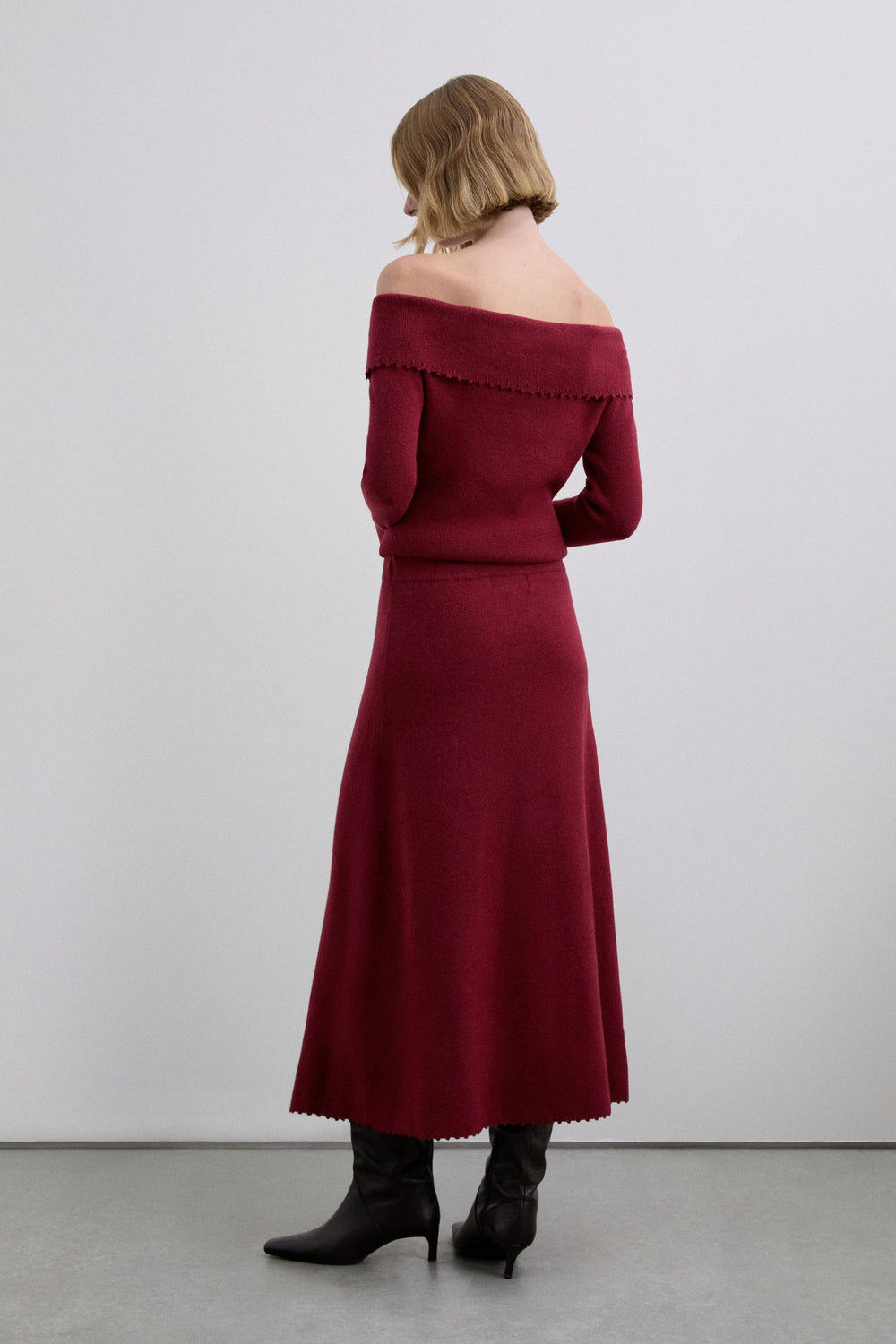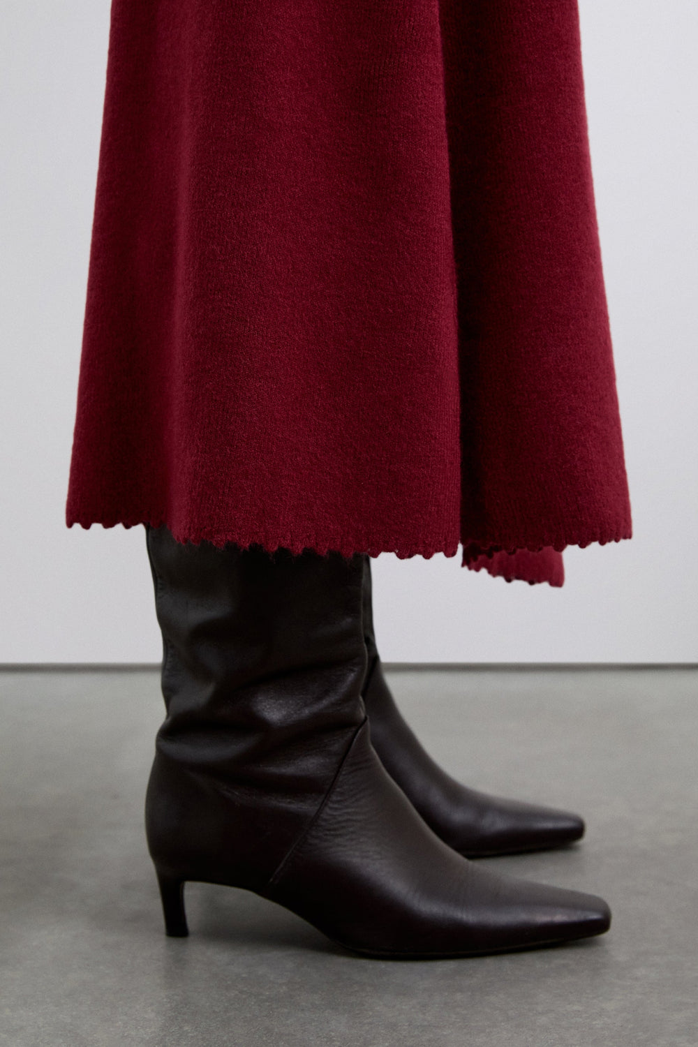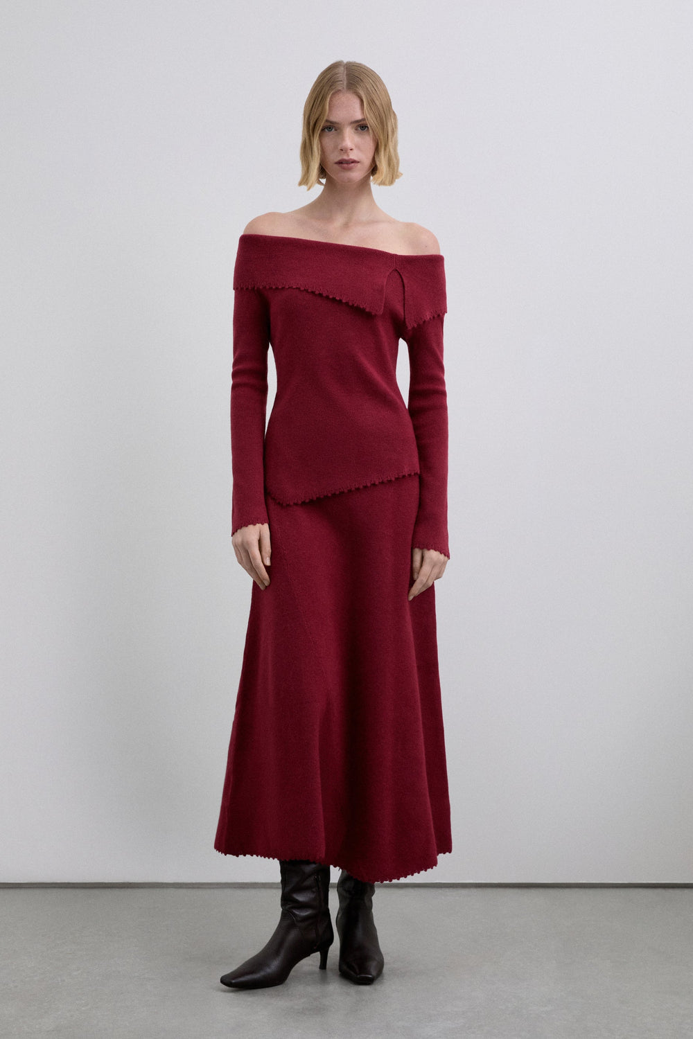 The skirt has an asymmetrical hem. It features a stitching detail along the skirt from the side to the hem. The hem is finished with special stitching. Elastic waistband.
