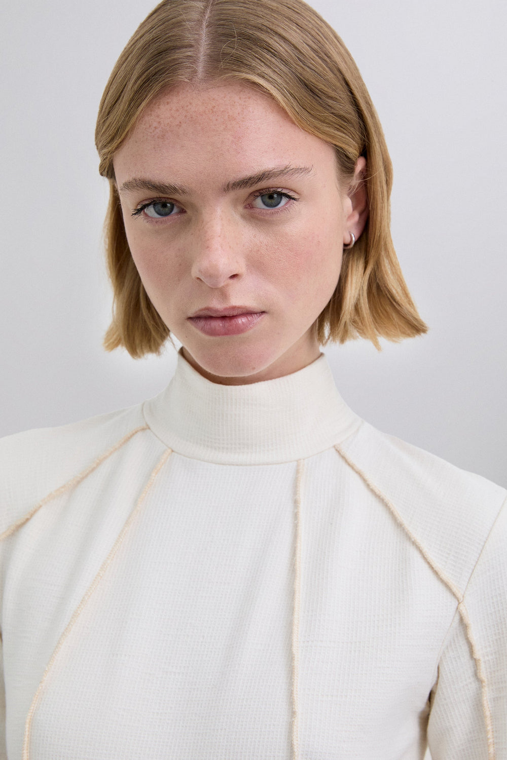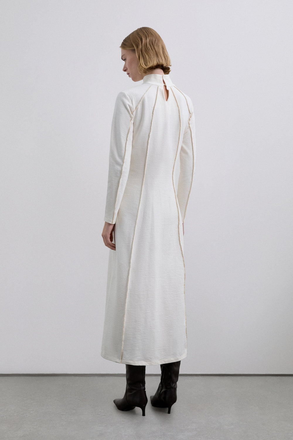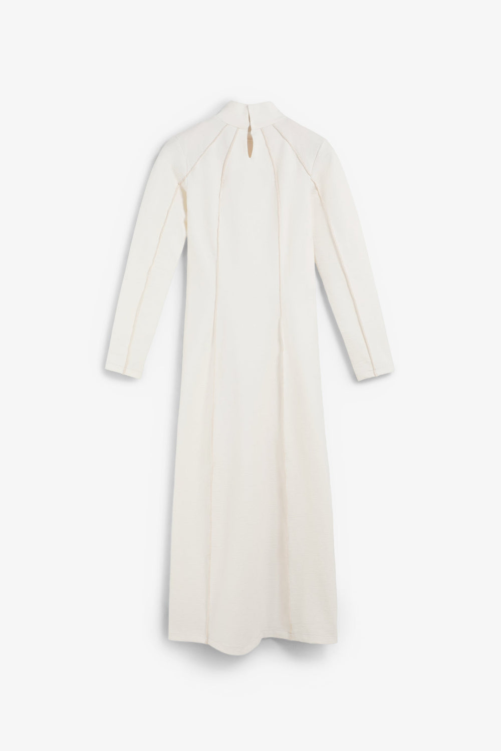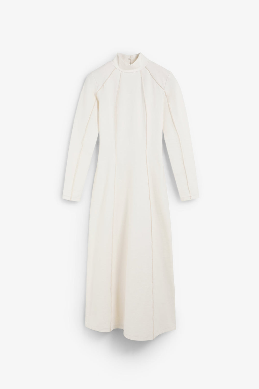 Knit midi dress made of BCI cotton. Long sleeves. High neck. Overlock stitch.