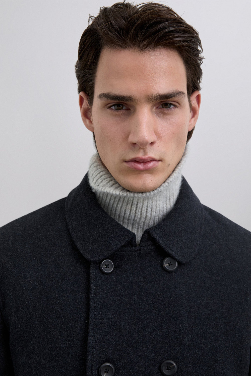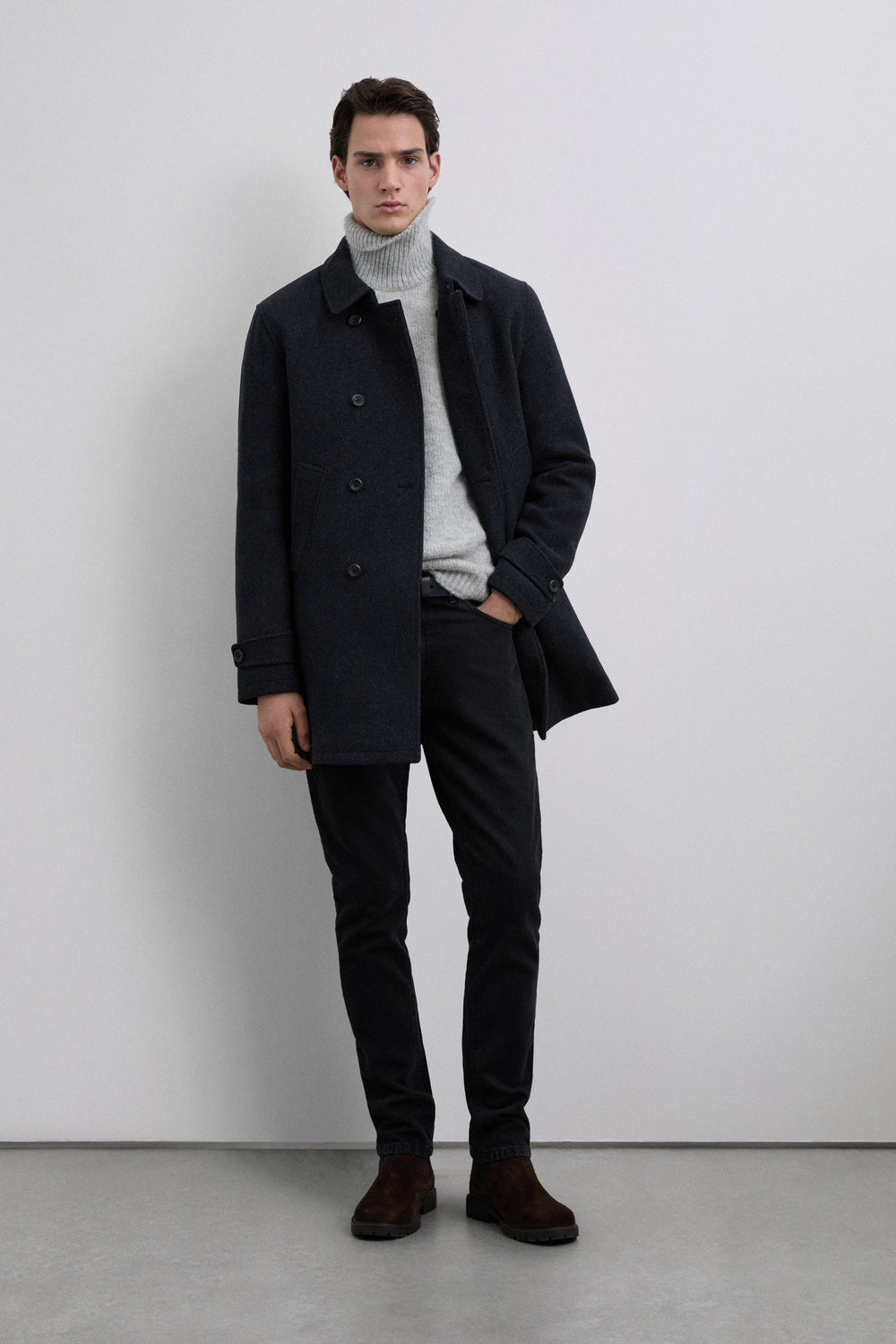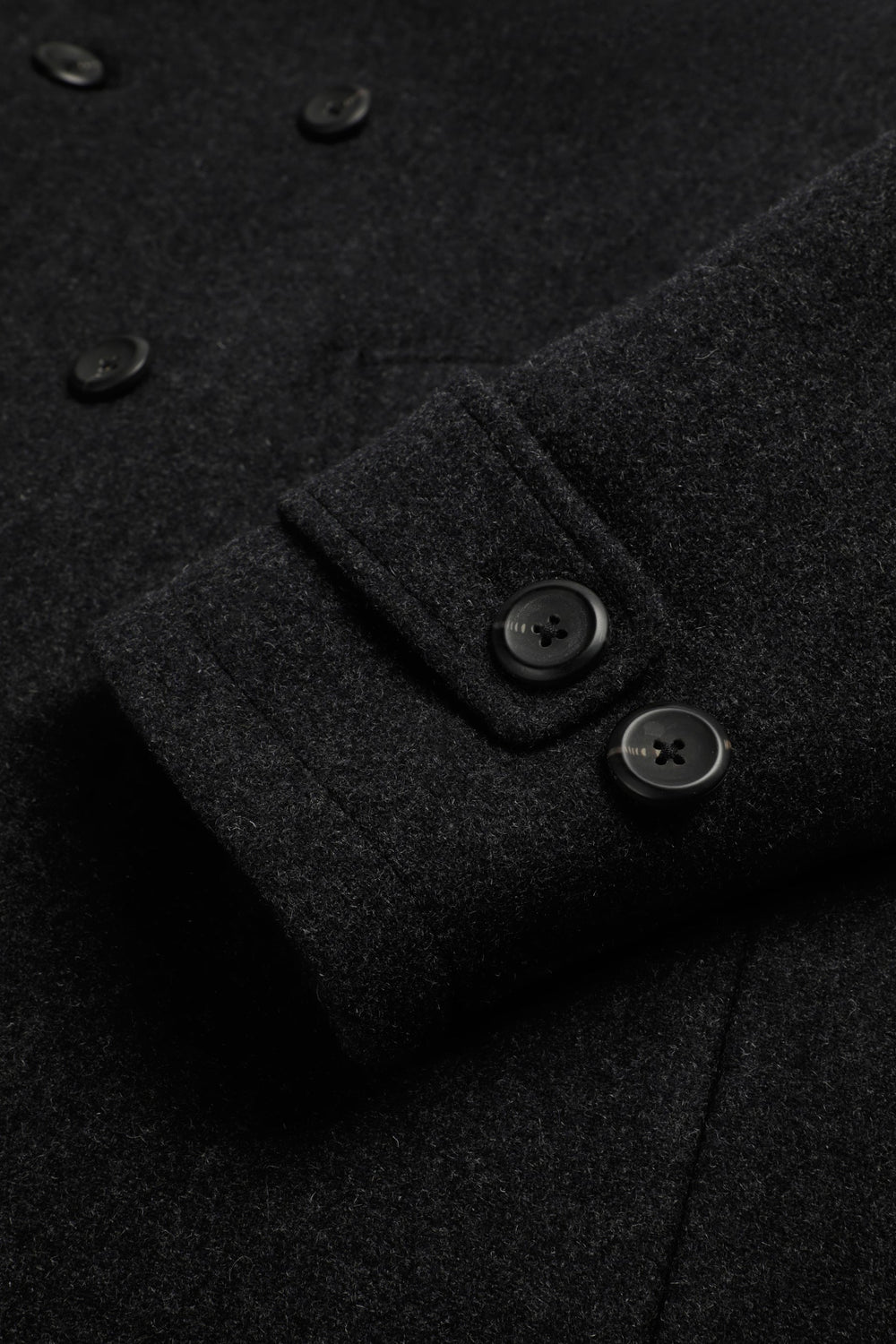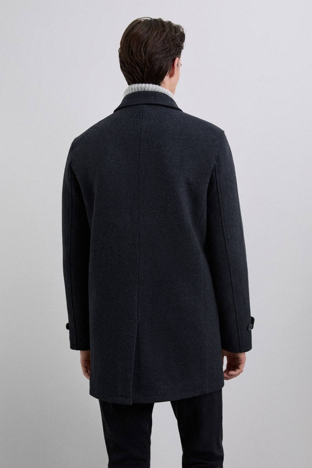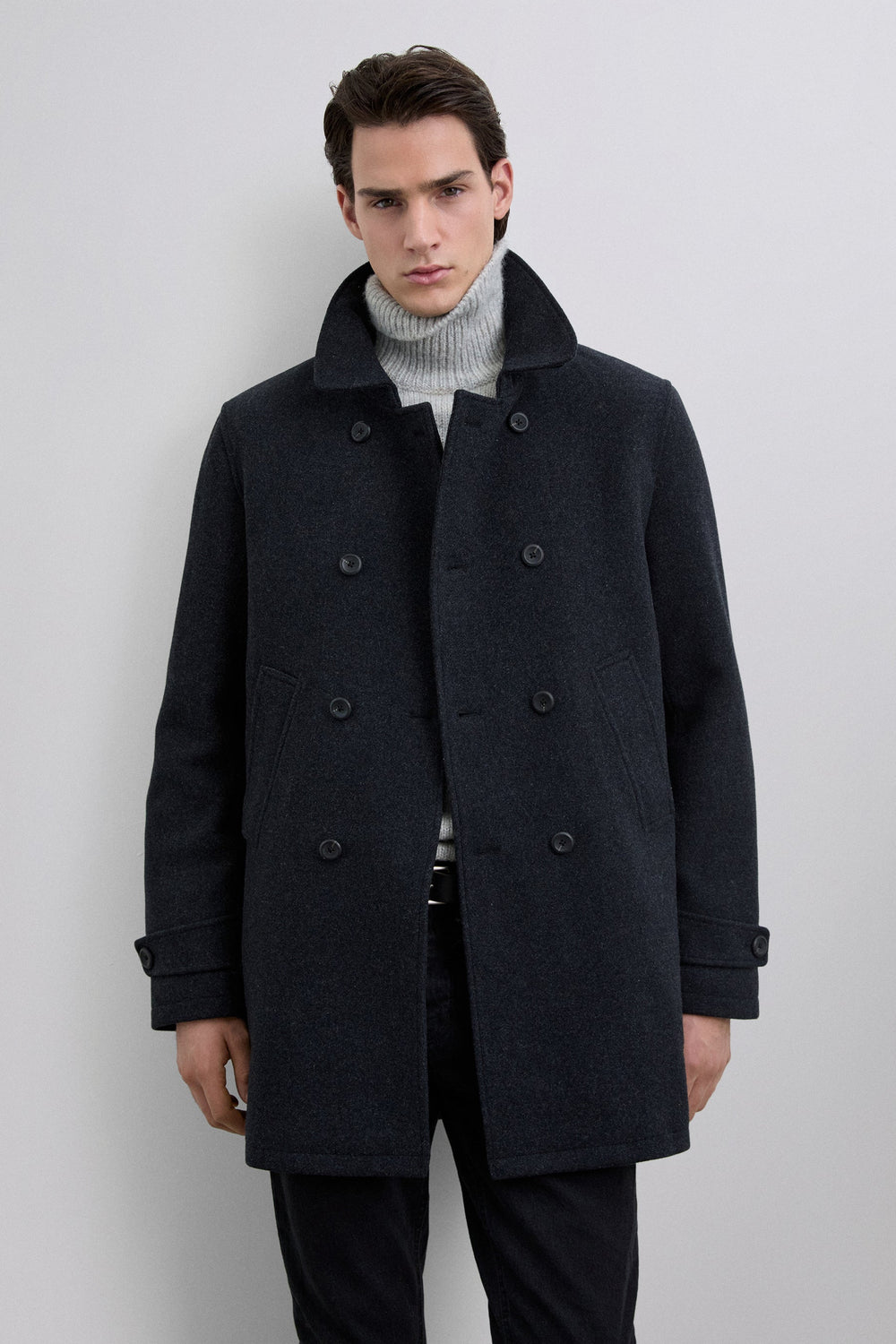Double-breasted coat in a wool blend. Button-up front. Front slanted piped pockets. Inner pocket. Cuff detail with tabs.