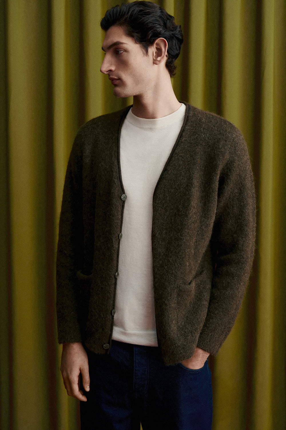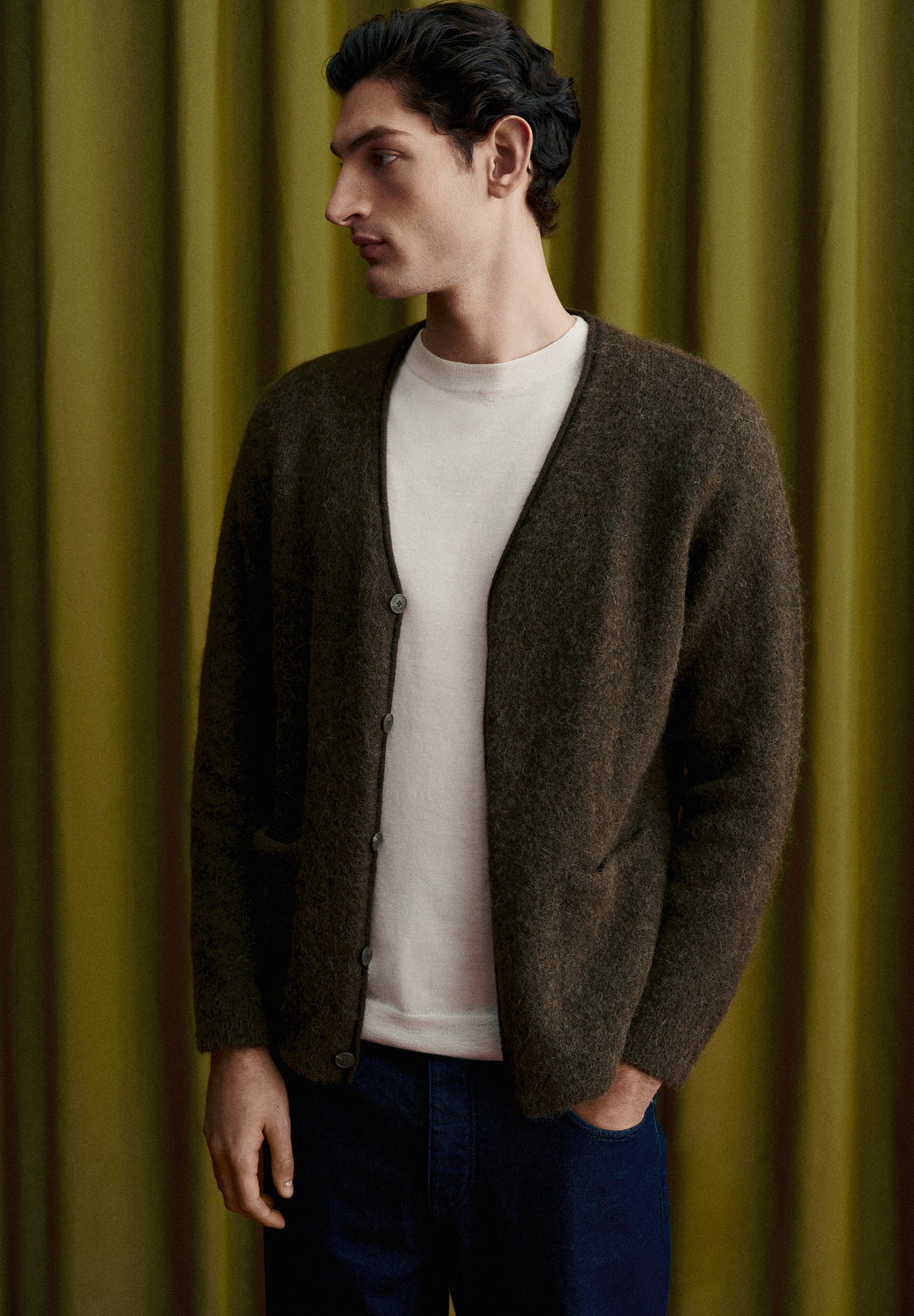 Alpaca cardigan. V-neck. Long sleeves. Front button fastening. Two front pockets. Logo label detail on inside.