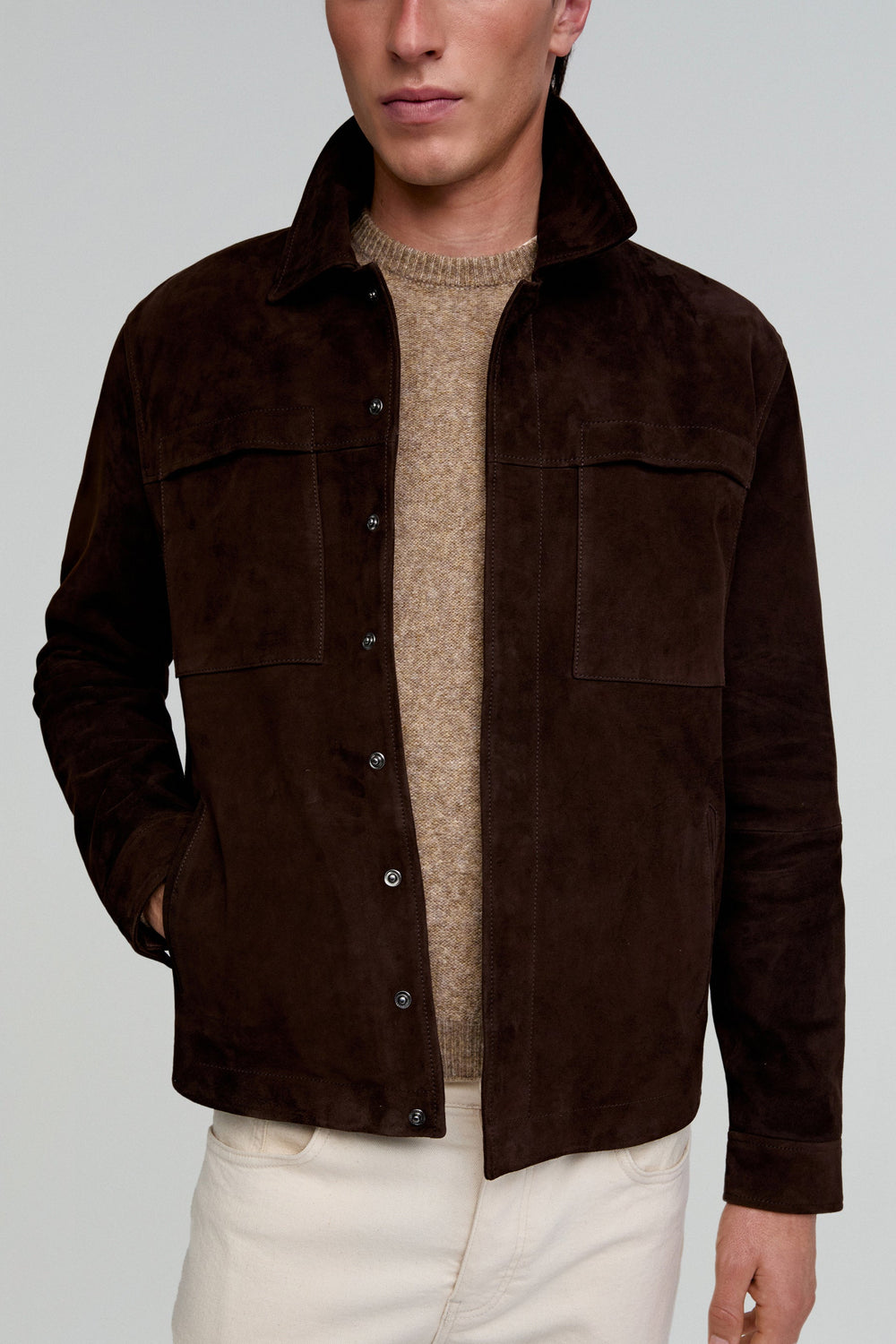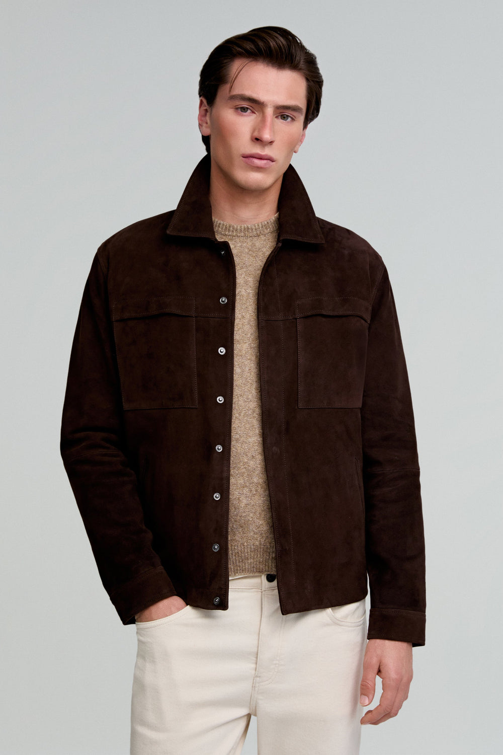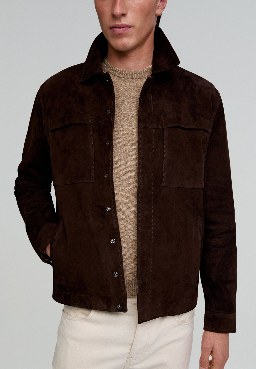 Suede jacket made of 100% leather. Regular fit, classic collar and button fastening with placket. Long sleeves with snap button cuffs. Front and side pockets.