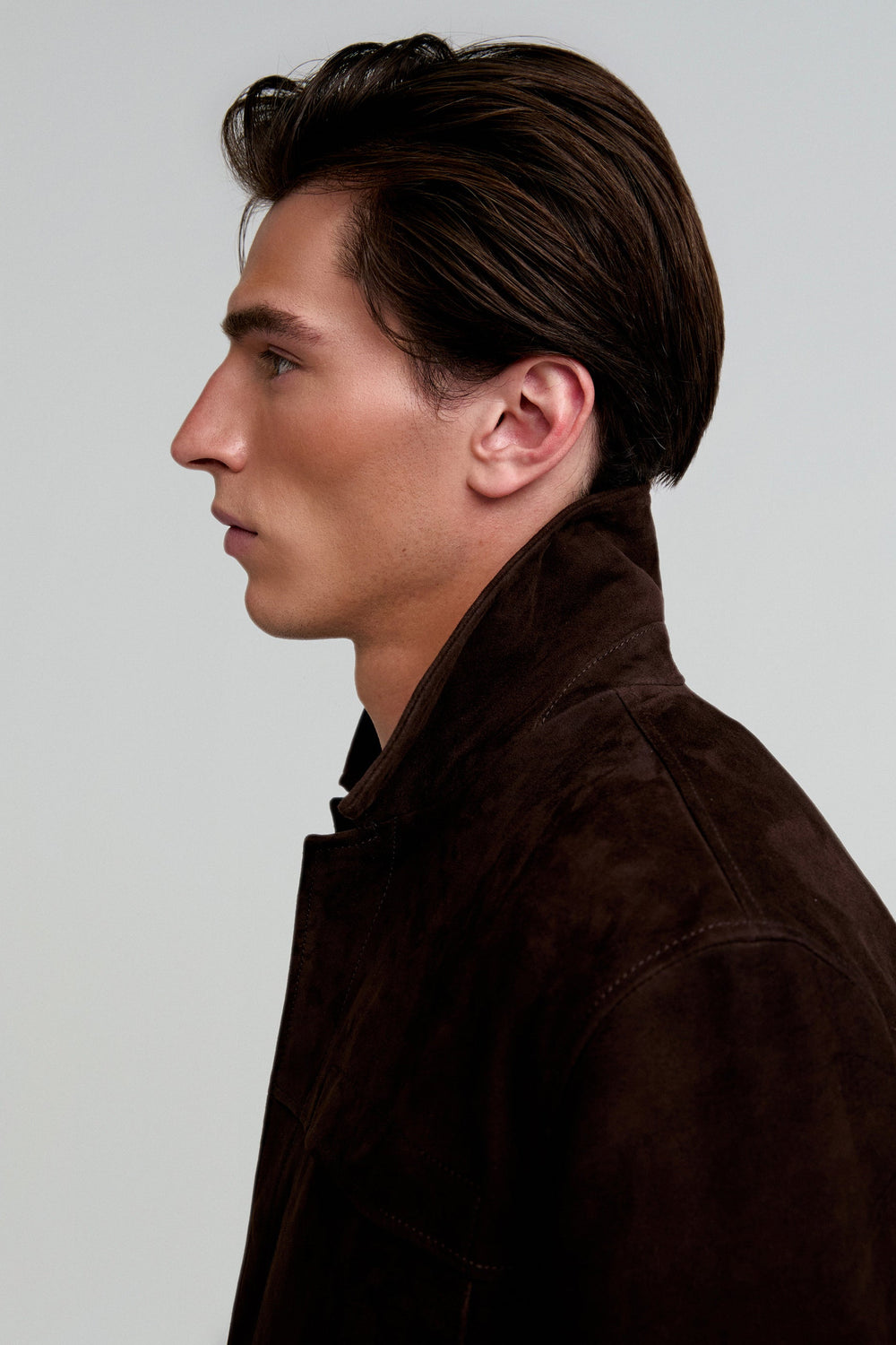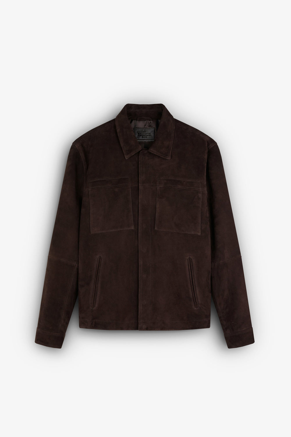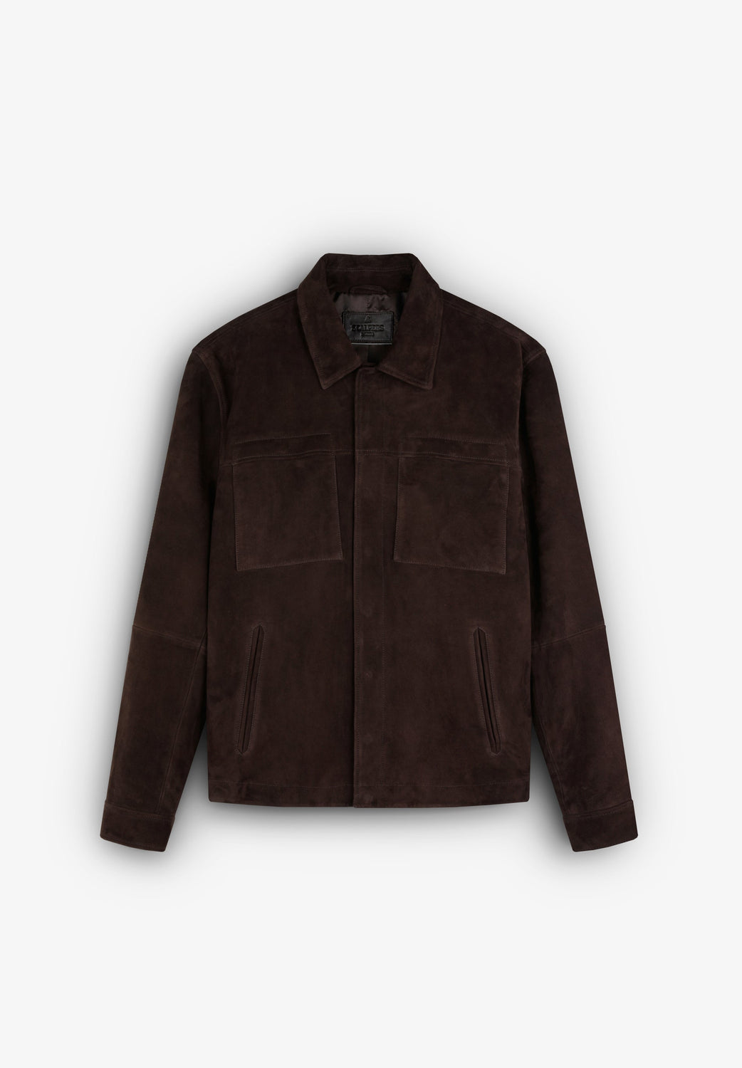 Suede jacket made of 100% leather. Regular fit, classic collar and button fastening with placket. Long sleeves with snap button cuffs. Front and side pockets.