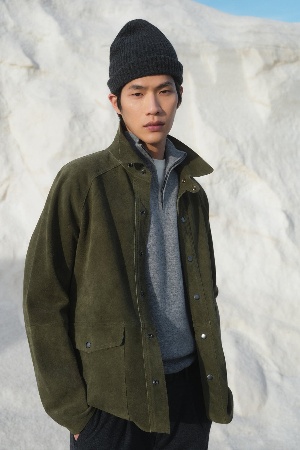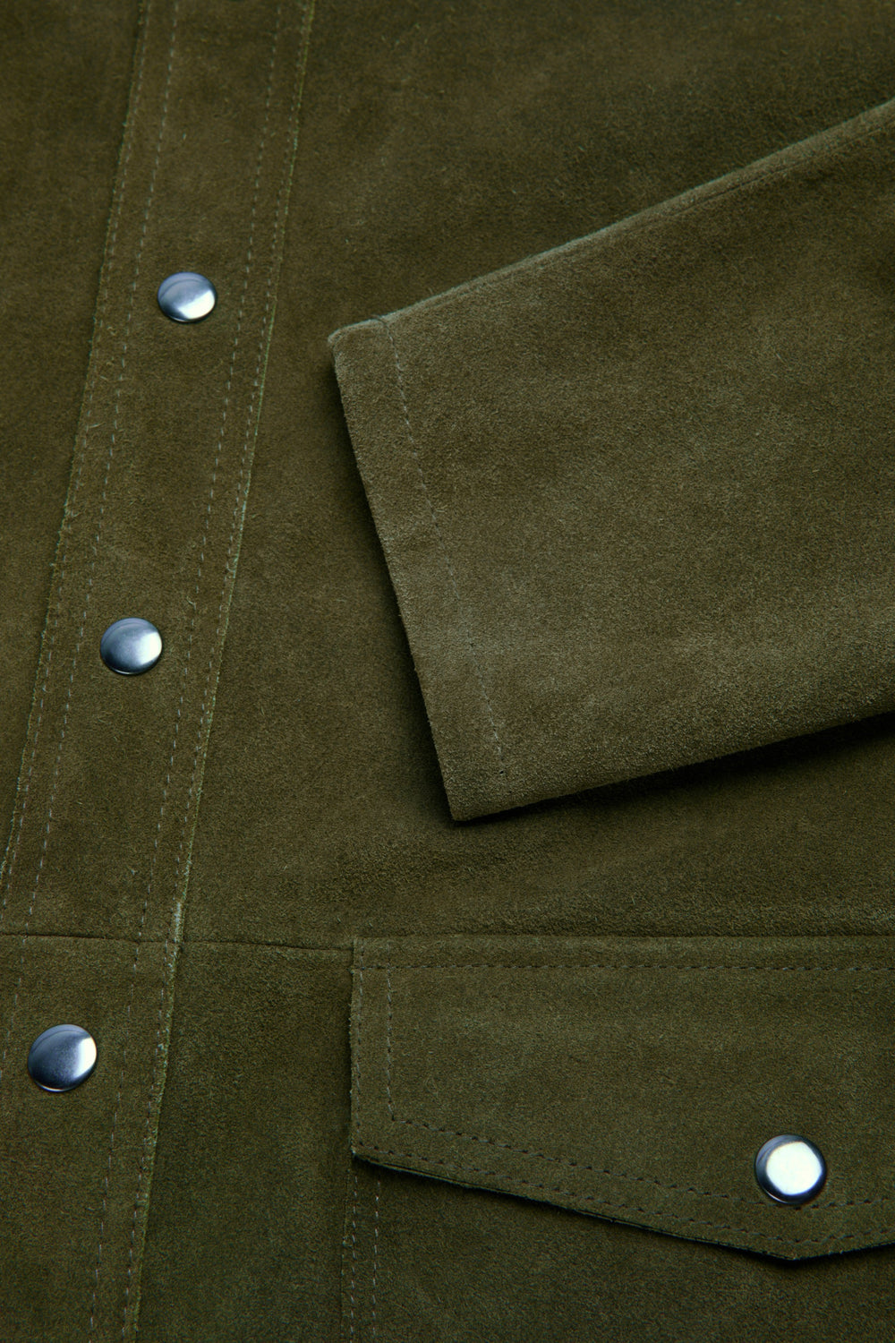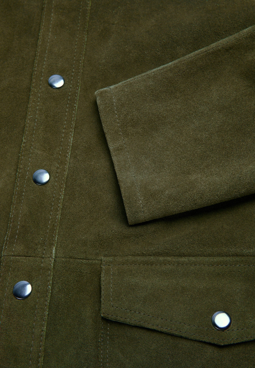 Jacket made of 100% leather. Regular fit, slightly rounded neck and snap buttons fastenings. Long sleeves and flap pockets with snap buttons.
