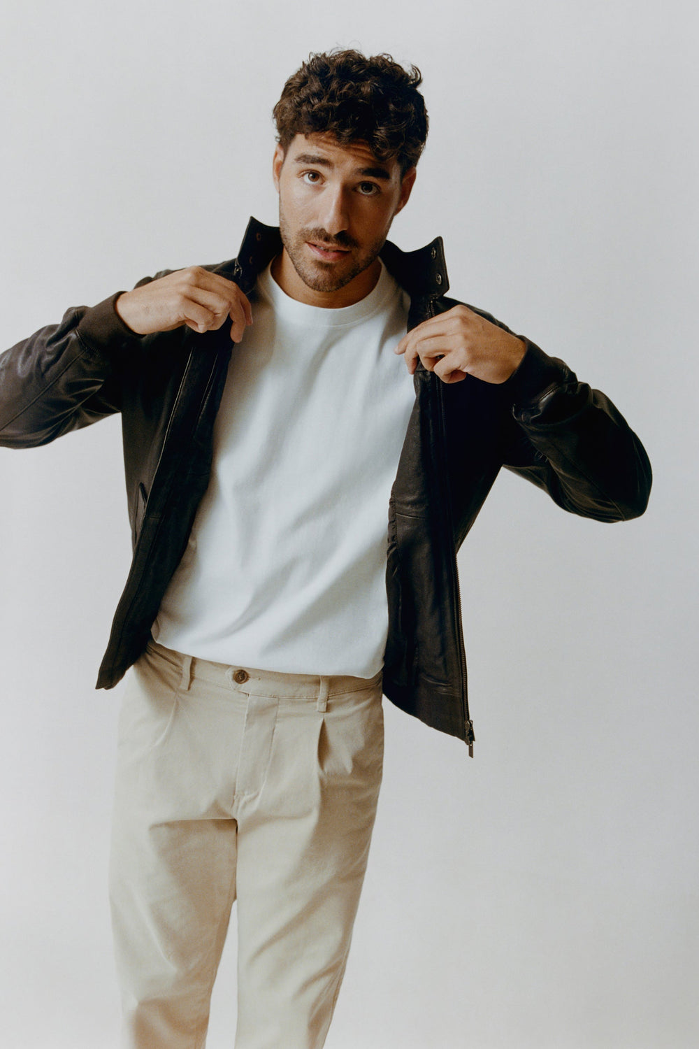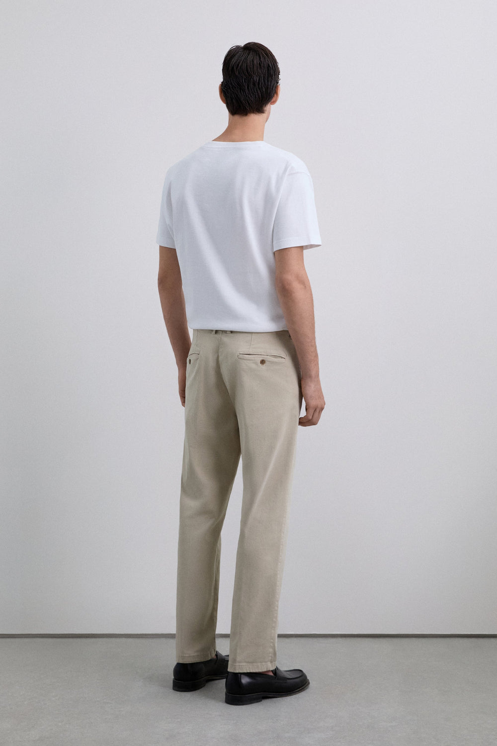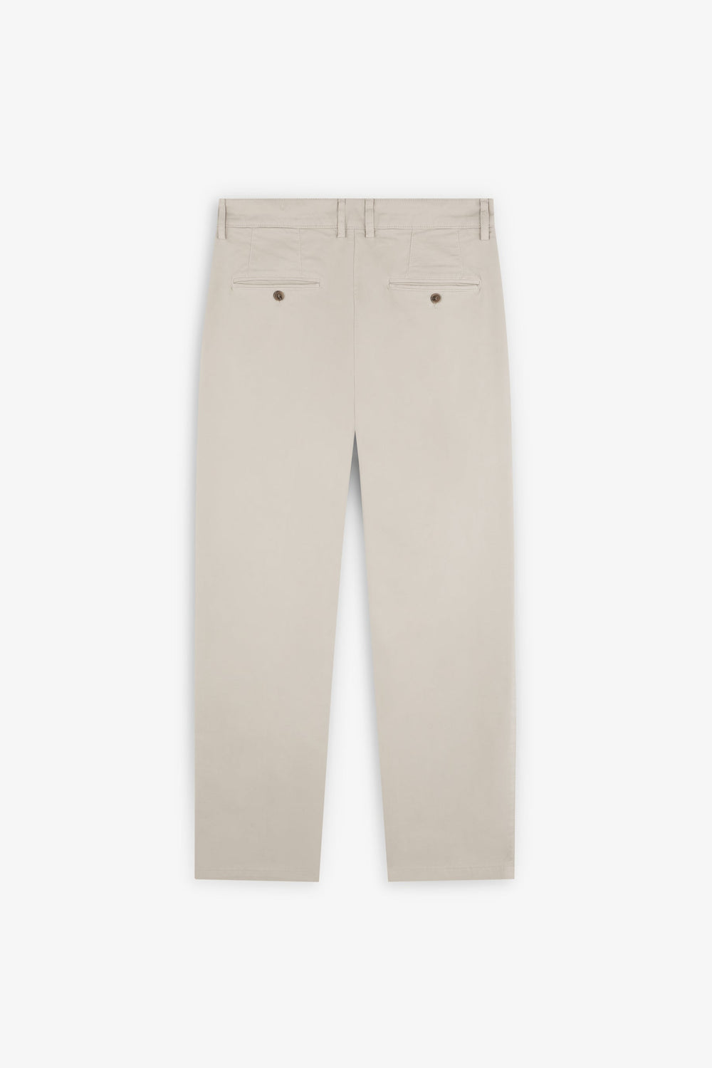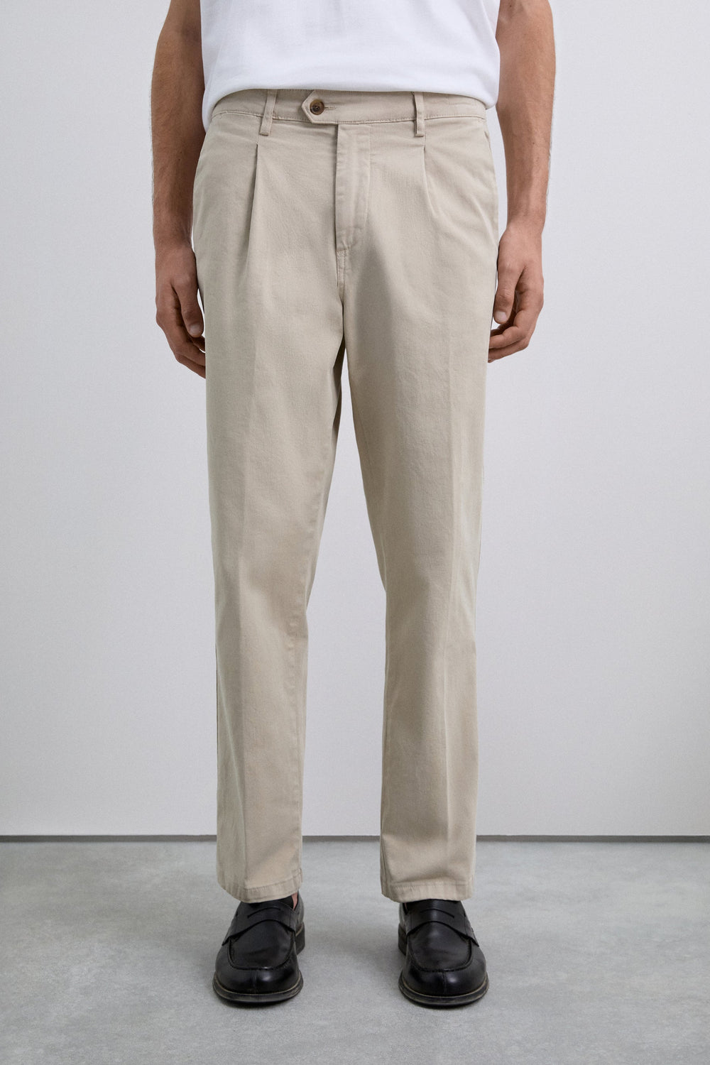 Chino trousers made of a slightly stretch cotton fabric. Loose fit with darts. Concealed zip fastening with placket and button at the waist. Side and back pockets. Belt loops.