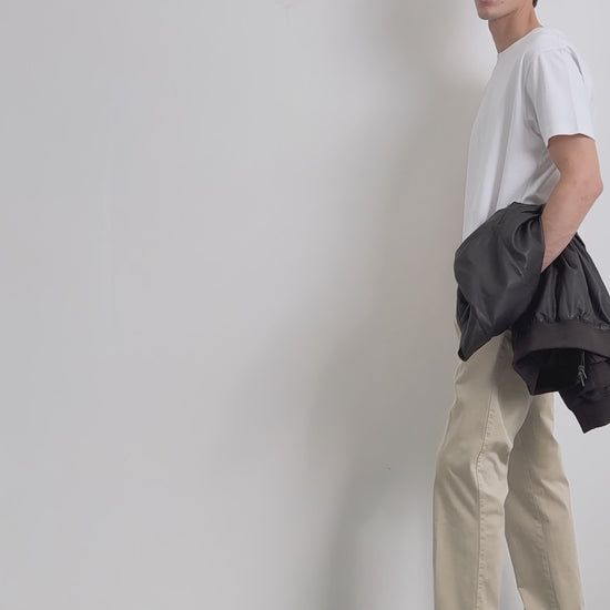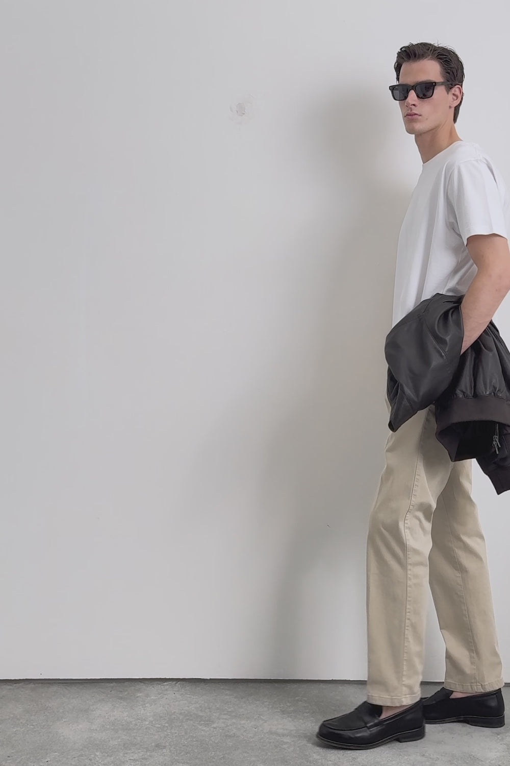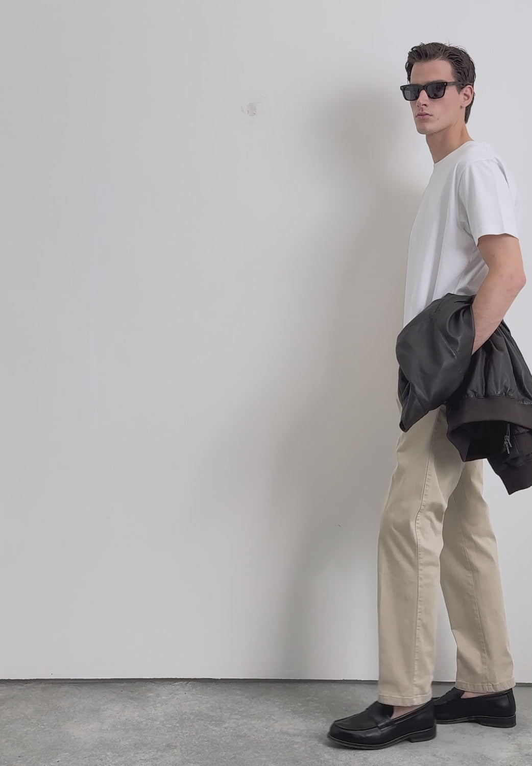 Chino trousers made of cotton. Loose fit with darts. Concealed zip fastening with placket and button at the waist. Side and back pockets. Belt loops.
