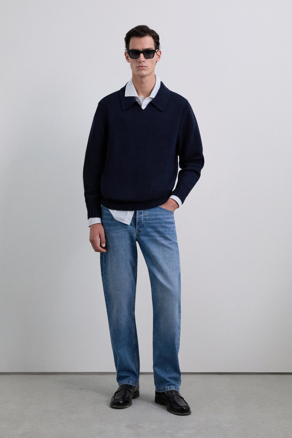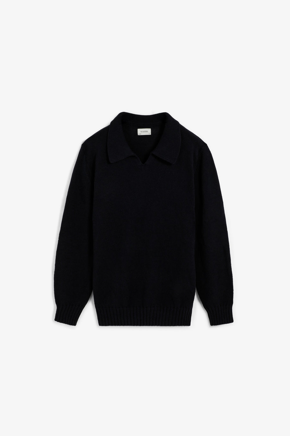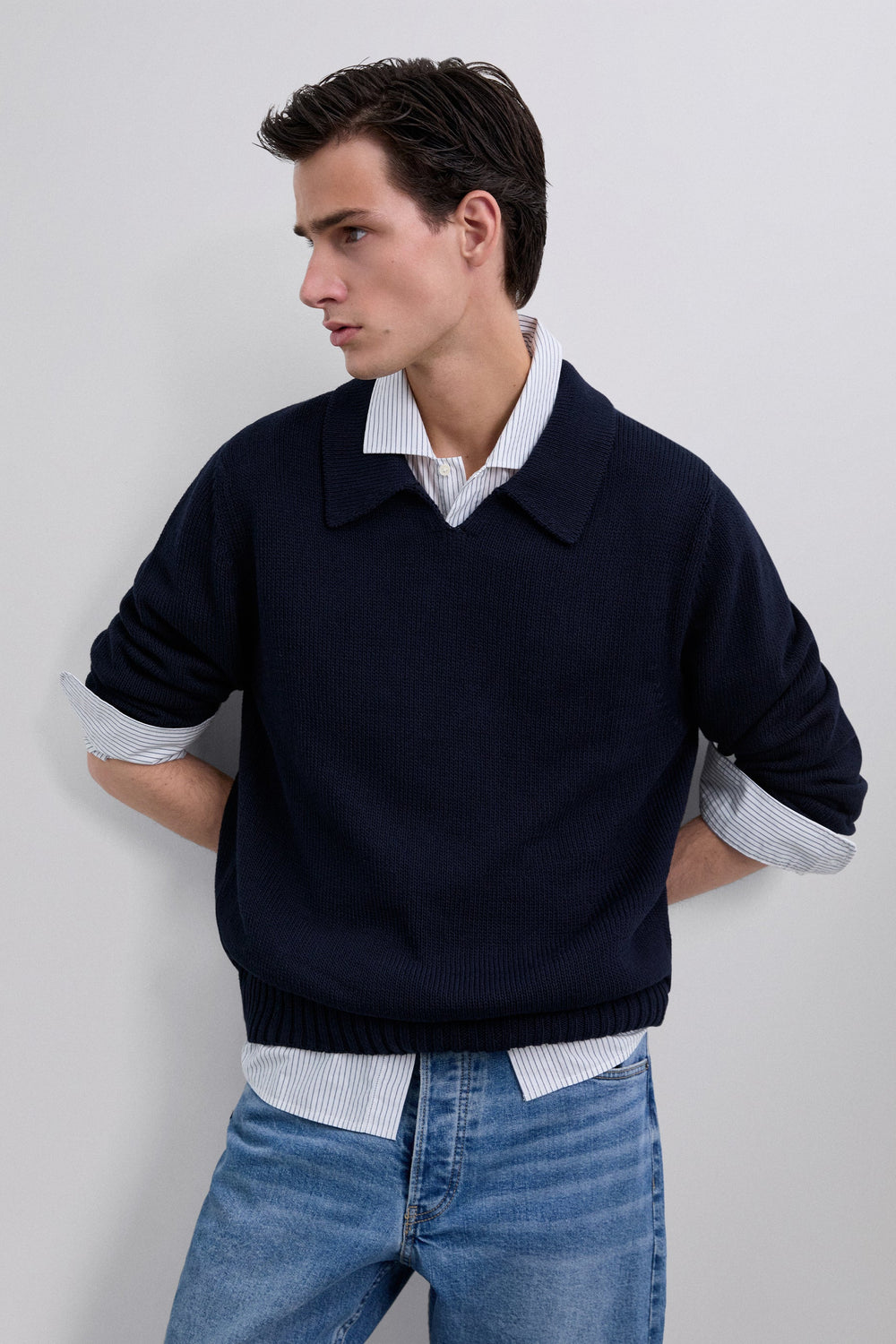 Knit sweater made of 100% BCI cotton. Polo shirt-style collar. Long sleeves. Ribbed trim.